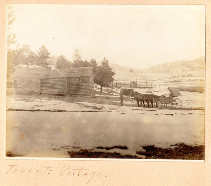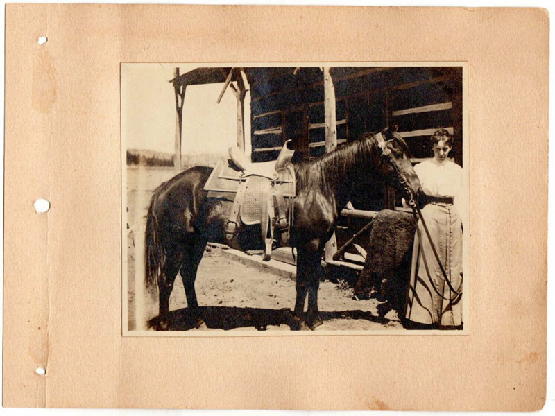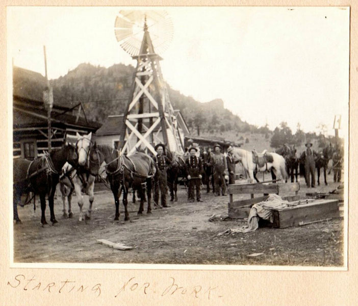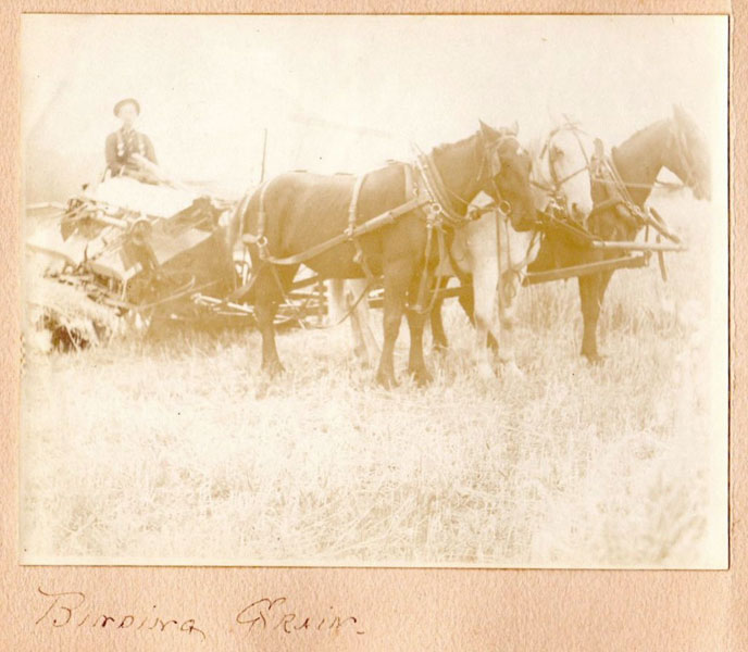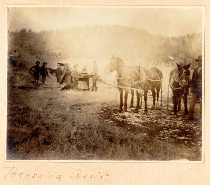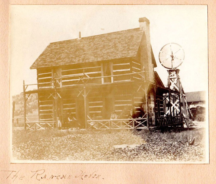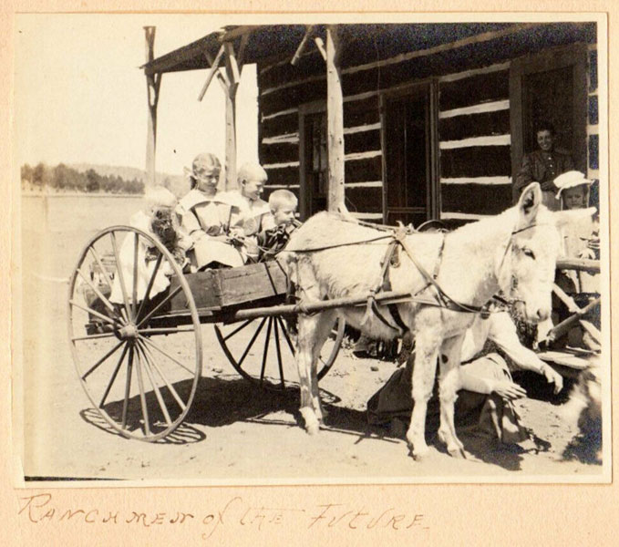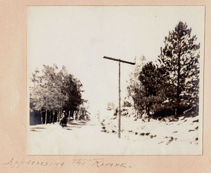 5 3/4" x 7 1/2" in thick gray paper boards with title (Kittredge Ranche) in manuscript on front cover and tied at spine with brown twine. Contains 24 - 3 3/4" x 4 3/4" silver print photographs and tissue guards. An intriguing album of ranch and farm life photographs. Pictures include a two-story log cabin ranch house, two tenants' cottages, a windmill, scenes of workers mowing, binding, measuring, stacking and threshing with equipment pulled by horses, scenes of farm fields; a view of Box Canyon by the Cripple Creek Road, a mountain view through two outcroppings; families are shown sitting on the porch, a woman posing by a western-saddled horse, four children and a cat wait in the buggy pulled by a white mule, adults chuckling; the interior living room with its "Hearthstone" fireplace and glassed-in book shelf; what appears to be an electrical line pole; Slater Creek, Box Canon, etc. Nine images show strong tonality, others in various strengths. 3" closed tear to foot of front wrapper along with rear cover of album detached. A wonderful collection.