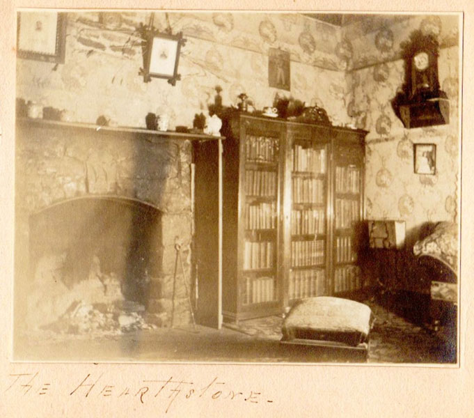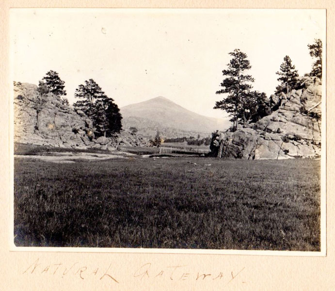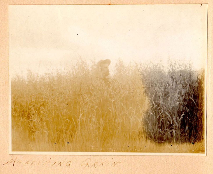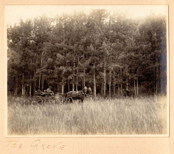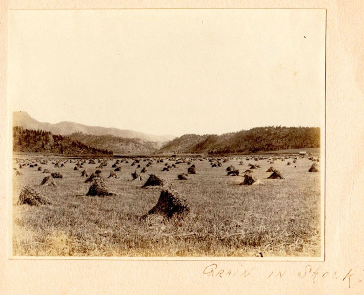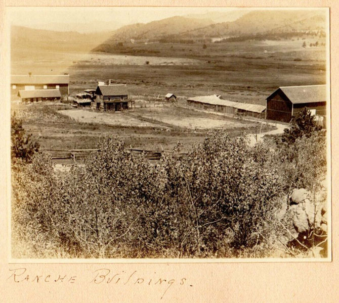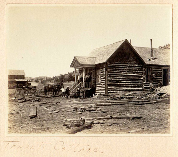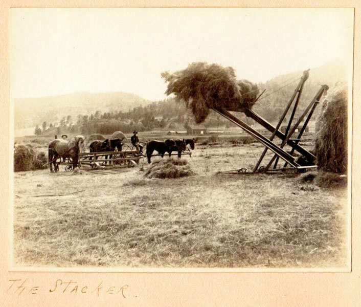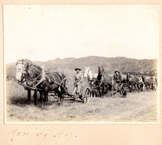 5 3/4" x 7 1/2" in thick gray paper boards with title (Kittredge Ranche) in manuscript on front cover and tied at spine with brown twine. Contains 24 - 3 3/4" x 4 3/4" silver print photographs and tissue guards. An intriguing album of ranch and farm life photographs. Pictures include a two-story log cabin ranch house, two tenants' cottages, a windmill, scenes of workers mowing, binding, measuring, stacking and threshing with equipment pulled by horses, scenes of farm fields; a view of Box Canyon by the Cripple Creek Road, a mountain view through two outcroppings; families are shown sitting on the porch, a woman posing by a western-saddled horse, four children and a cat wait in the buggy pulled by a white mule, adults chuckling; the interior living room with its "Hearthstone" fireplace and glassed-in book shelf; what appears to be an electrical line pole; Slater Creek, Box Canon, etc. Nine images show strong tonality, others in various strengths. 3" closed tear to foot of front wrapper along with rear cover of album detached. A wonderful collection.