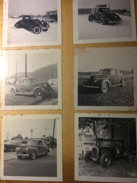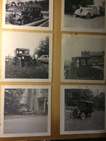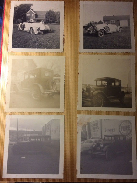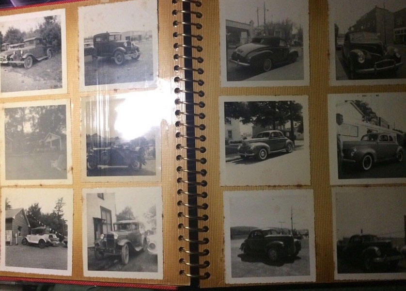 12" x 10" red linen binder with title (PHOTO ALBUM) on a plaque and raised on front cover. A collection of 110 black and white photographs (3 1/2" x 3 1/2") glued to 20 thick cardboard sheets. Someone took the time to seek out and photograph vintage American-made automobiles where they were found. There are Fords, Chevrolets, Pontiacs, Packards, Studebakers, Mercurys, Plymouths, La Salles, Buicks, Oldsmobiles, etc. The photographs were taken in the 1960"s through the early 1980's and are photographs of cars manufactured in the 1910 through 1940 time period. Some of the photographs have faded a bit but most are clear and easy to read. Overall a very good group. Spotting to several photos.