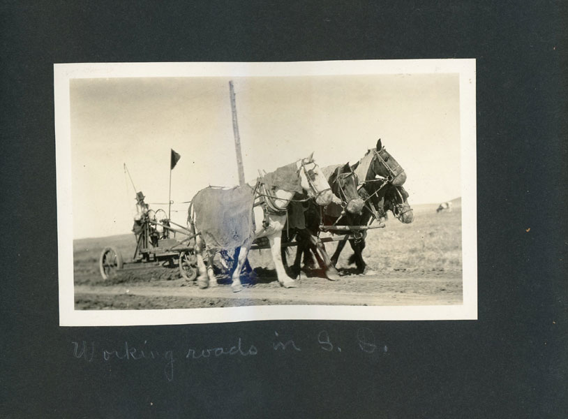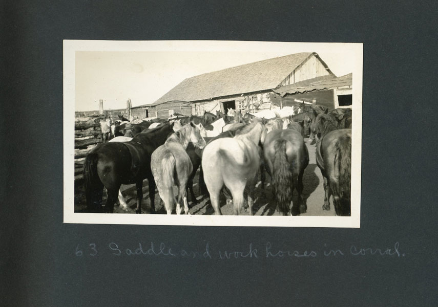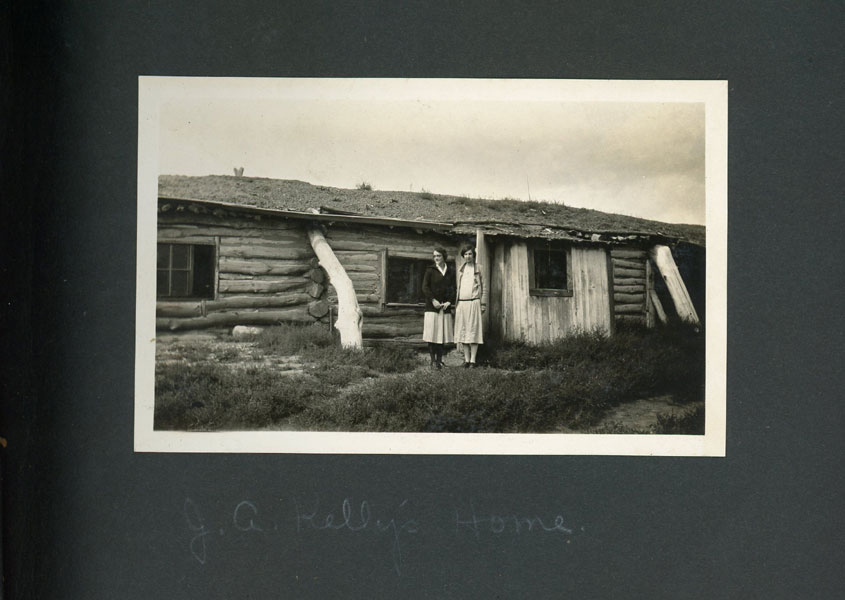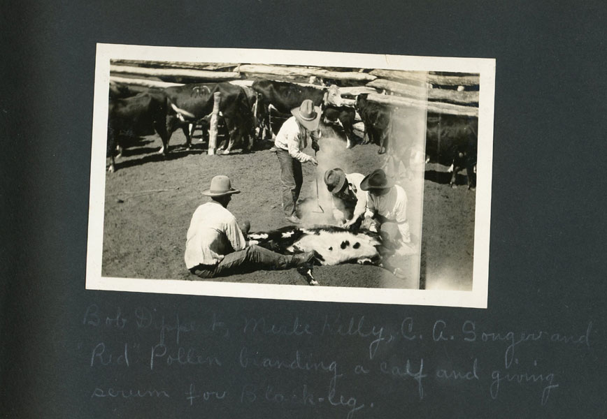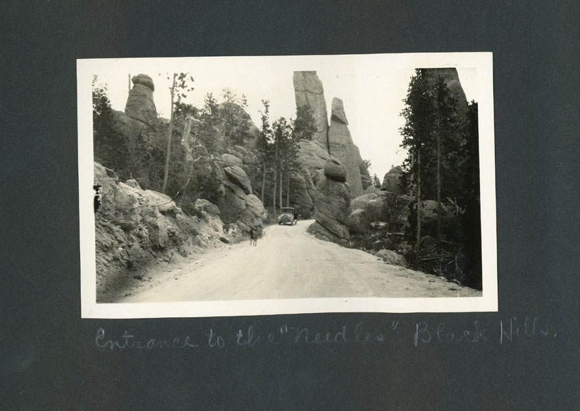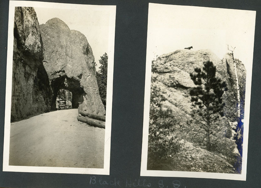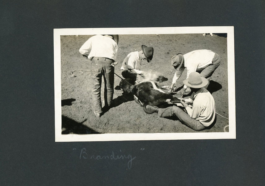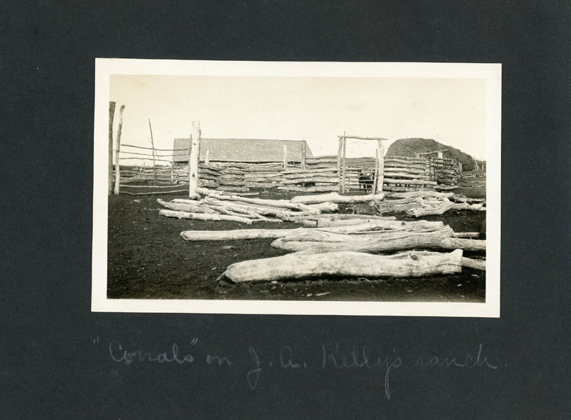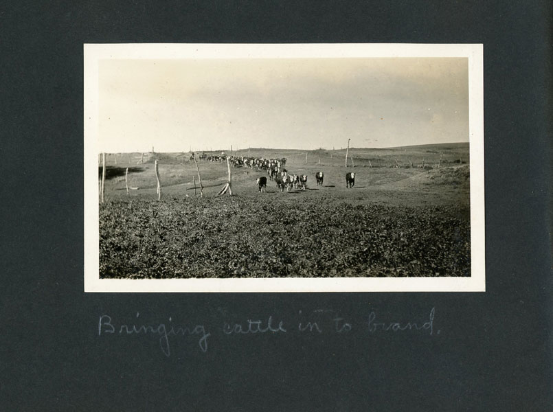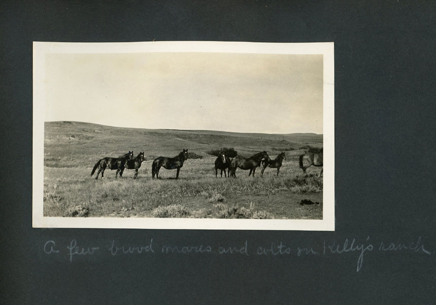 Oblong photograph album measuring approximately 6 3/4" x 11," bound in pictorial leather, tied at spine with leather strip and housed in custom cloth clamshell case. Contains 81black and white photographs, 3 1/2" x 5 3/4," with all but a few identified with captions. A fascinating album documenting a real working ranch in South Dakota near Rabbit Creek. "John 'Jack' A. Kelly (1864-1942) married Sarah Alice 'Allie' Drew in 1895 and settled on the Rabbit Creek place in Faith, South Dakota. The first improvements were of log and sod, and the ranch ran cattle, sheep and horses on the open prairie. The closest place to get supplies was Belle Fourche, South Dakota, and they made those trips for supplies in the spring and fall. In those early days, the cattle were shipped from Belle Fourche or from Everetts, South Dakota, on the Missouri River where they crossed on pontoon bridges to reach the railroad. They also loaded horses on to railcars and shipped them to Chicago to be sold as well." Photographs include images of the rural ranch house, Mud Butte, horses on the open range, brood mares, crude corrals, ranch hands herding and branding cattle, an old sod house near Bixby, scenery around Hill City, wagon travel, road building, a monument of Henry Weston Smith in Deadwood, Black Hills Highway which is no more than a dirt road, Sylvan Lake, working horses, Needles Highway, tunnel on Needles Highway, scenery around Spearfish, Deadwood, Hill City, and Black Hills, and much more. A rare glimpse of ranch life in rural South Dakota. Covers worn and rubbed, captions faded but still readable, images strong.