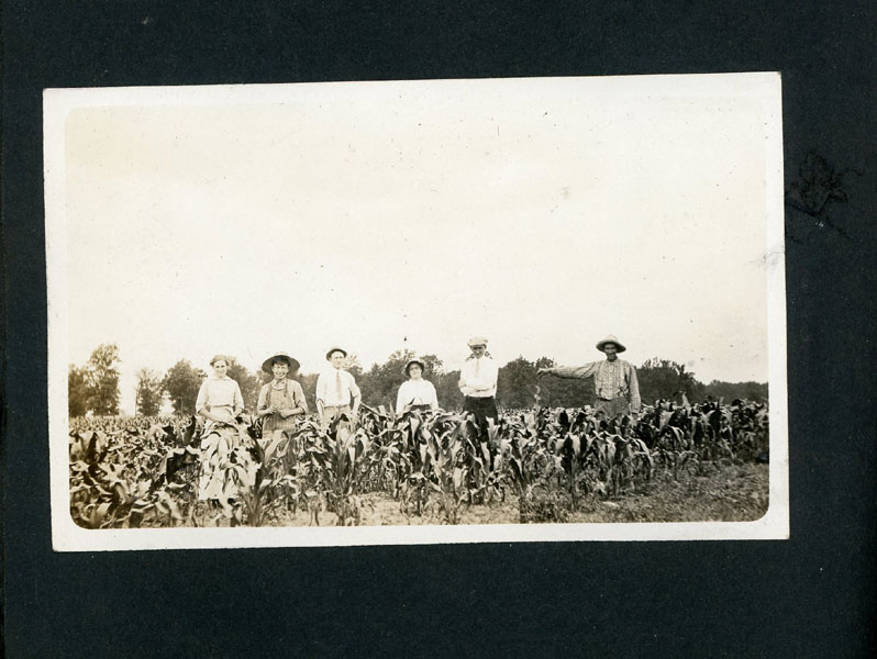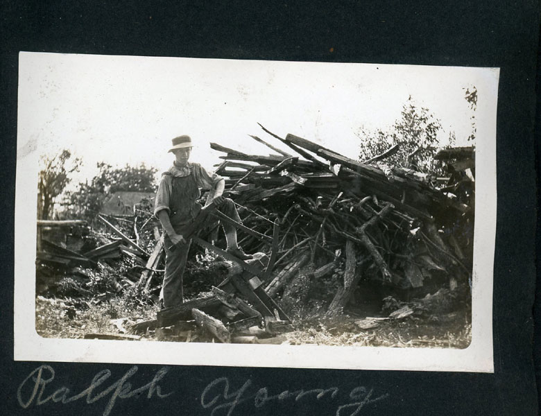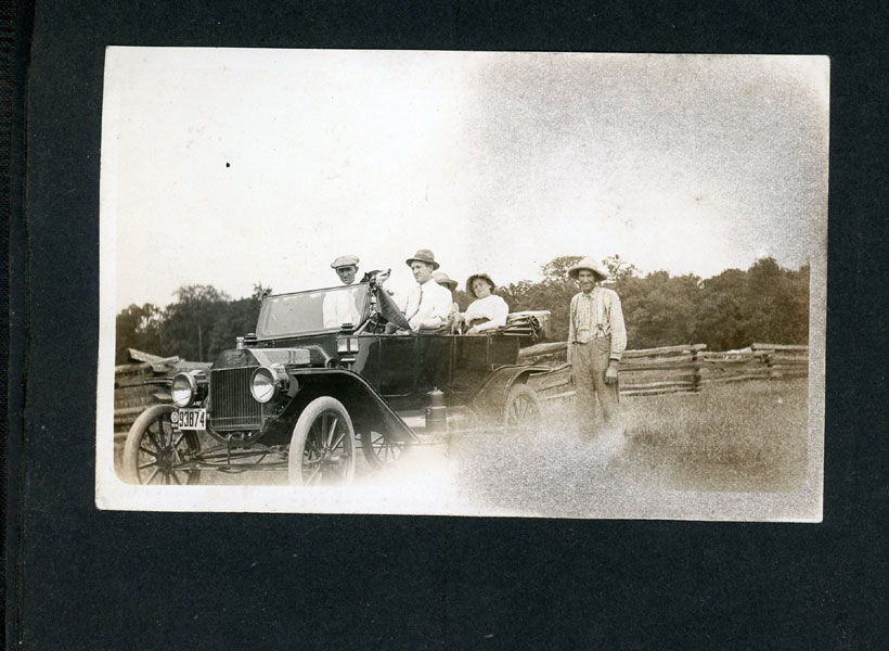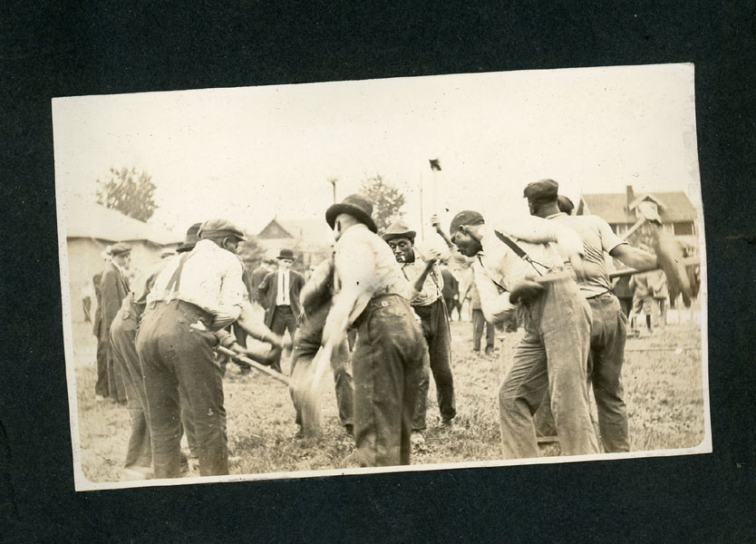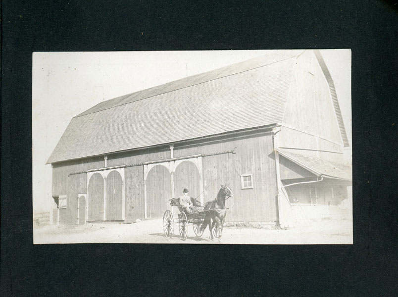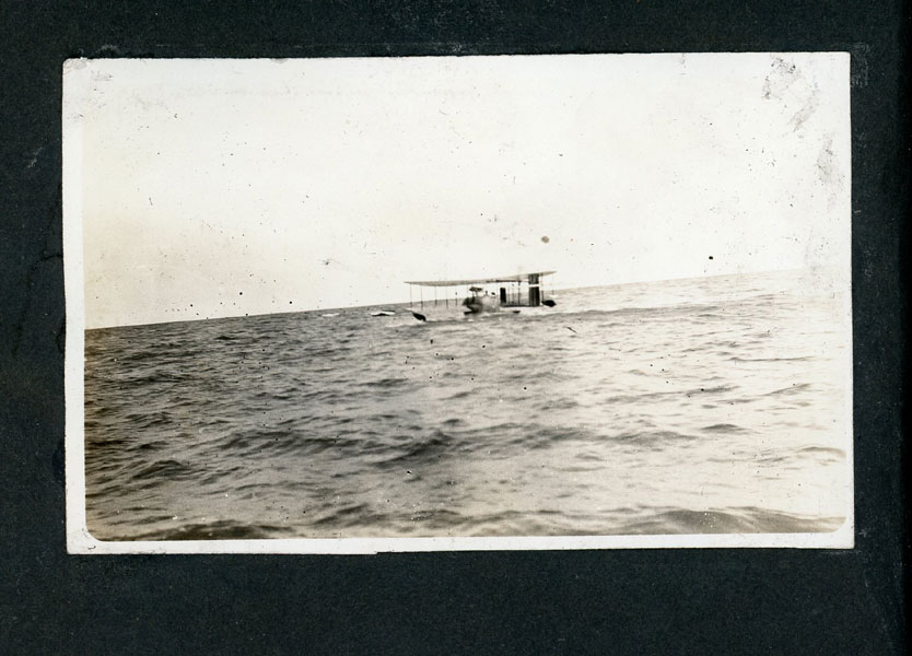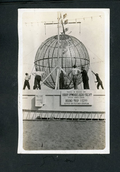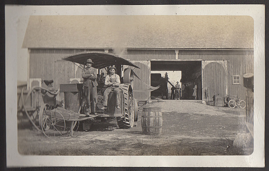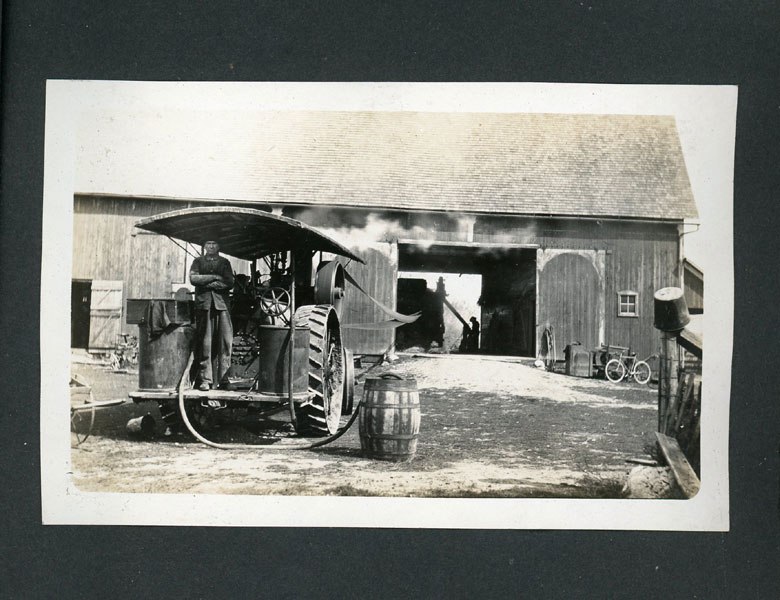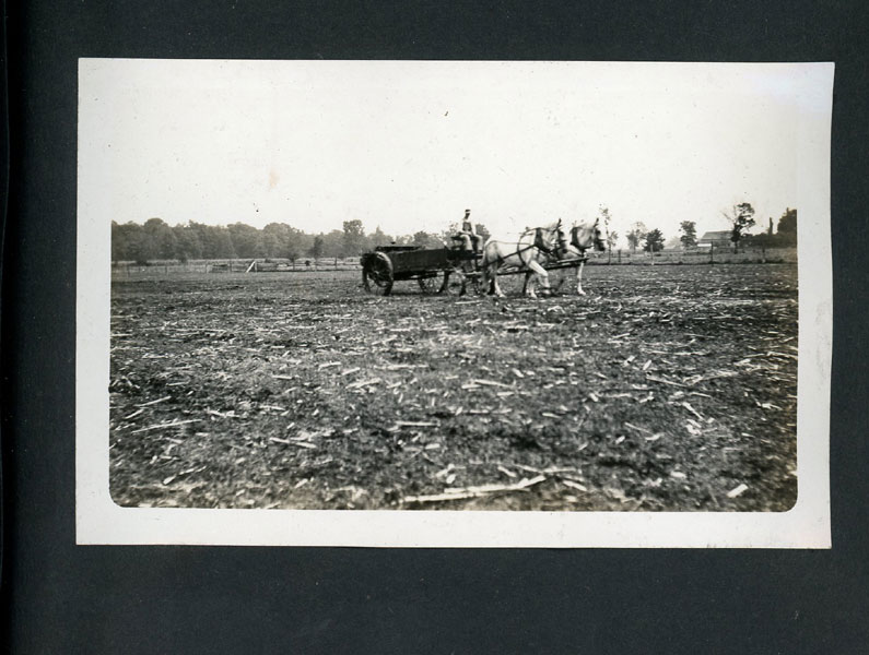 6" x 7 1/2" faux leather album containing 50 photographs (mostly silver gelatin as well as two cyanotypes), most measuring approximately 3 1/2" x 5 1/2," and all being glued to album pages which has caused some to become a bit wavy. Six of the photographs are captioned. The album is identified as the “Property of Fred J Hildebrand," hand-written on the inside of front cover. The photographs document an Ohio farm family’s life and includes images of African-American roustabouts erecting tents for a Barnum & Bailey Circus as well as images of Harry Atwood’s hydroplane rides over Lake Erie. Public records show Hildebrandt as living in northwest Ohio in the vicinity of Toledo, and his photographs provide a vivid view of early 20th century Midwestern farm life. Images include farmhouses, barns, horse-drawn wagons and buggies, Auglaiz Power Dam, automobiles, steam tractors, cattle, ducks, horses, chicken feeding, cutting wood with a large crosscut saw, cornfields, gardens, a woodpile, family members, etc. Of special interest are three photos of a Barnum and Bailey circus visit ... one of an elephant and two of African-American roustabouts driving tent stakes. More importantly are three photographs documenting a barnstorming visit of famed early aviator Harry Atwood offering hydroplane rides in his "aero-yacht" over Lake Erie. A wonderful record of early 20th century Midwestern farm-life made more desirable by the inclusion of important early aviation and African-American circus images. Although they are generally clean, a few show some light soiling and edge wear. It appears that some may have been relocated within the album. The album has some light wear; its pages are all attached, but some appear to have been tipped in.