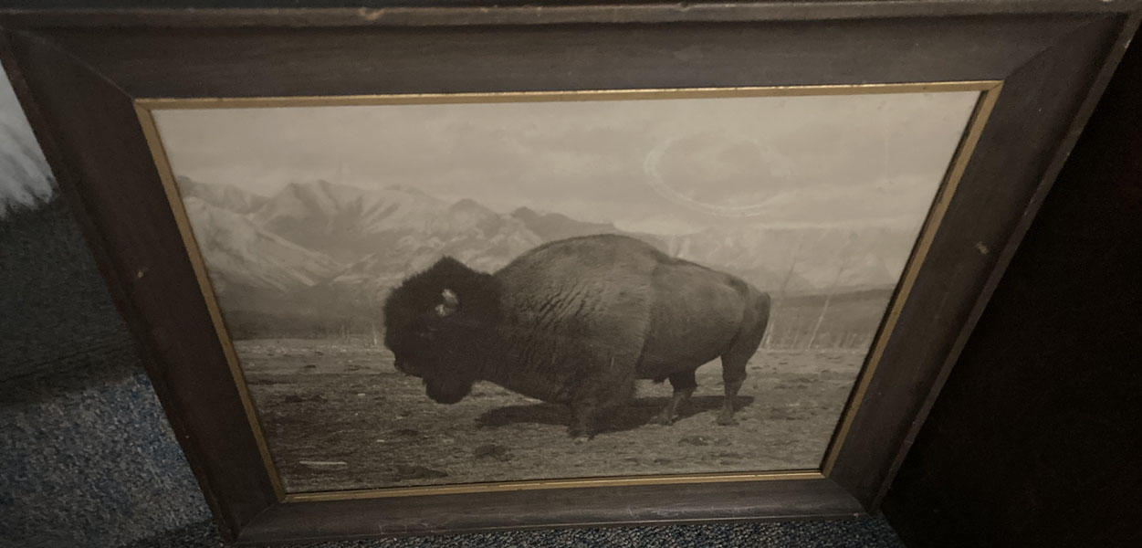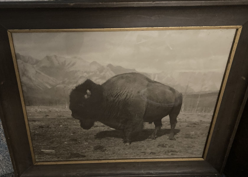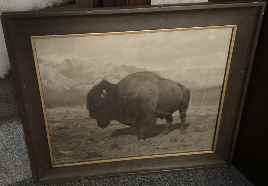 Vintage framed, black & white photograph of a Buffalo Bull from the Mission Buffalo herd The size of photograph and frame is 20 1/2" x 16." The photograph is 15 1/2" x 12 1/2." The Mission Herd is part of a Bison protection range that was established in 1905 and stocked with descendants of bison rescued from extinction. This sanctuary protects hundreds of bison on approximately 20,000 acres of rolling grassland and forest. The frame is the original and on the back panel are the words "Mission Mountains, Buffalo Herd Bull." Good contrasts of the image and in very good condition.
