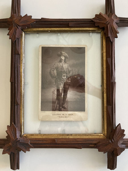 Cabinet Card. 3.75" x 5.5" photograph mounted on a 4.25" x 6.5" card. Printed below image: Copyright. Woodburytype. Colonel W. F. Cody. "Buffalo Bill." Buffalo Bill first took his Wild West Show to England in 1887. This very scarce and attractive image was taken in England in 1887. A handsome image, in very sharp focus, with Cody in full show regalia including fringed buckskin jacket, his trademark oversized belt buckle, leather hip riding cavalry boots, and posing with his Winchester rifle. Provenance: "From a family whose relatives witnessed a "private invitation performance" of the show on December 17,1887, at Manchester Race Course." Exceptionally clean, bright, unfaded image. Preserved by the family, framed between two pieces of glass with a nicely-carved frame, 12" x 14.25." Near Fine.