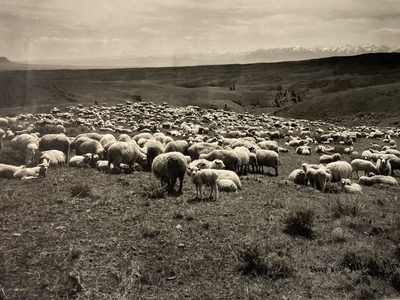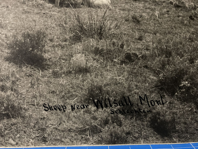 Silver gelatin photograph [27 cm x 34.5 cm] / [10.5" x 13.75"]. Title in the negative. View of a herd of sheep. Albert Schlechten (1876-1962) initially established a portrait photography studio with his brother but he spent most of his time and efforts on location and landscape photography. Shortly after his move to Montana in 1900, Albert purchased an 11x14 in. field camera and began photographing the mountains, rivers, lakes and farmland around Bozeman. Established in 1900, the Schlechten Brothers, became renowned for Albert's landscape photography. Glue remnants on the reverse, otherwise in nice condition with strong contrasts.