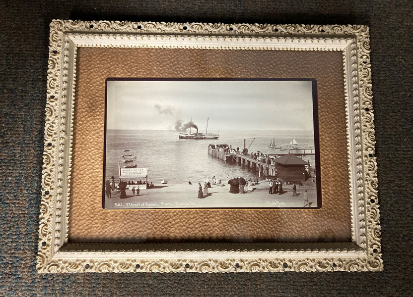 Photo #541. Framed and mounted 5 1/4" x 8 1/4" silver gelatin photograph in 9 1/2" x 13" frame. Photo shows men, women and children gathered on the pier and on the beach on Santa Catalina Island. In the background is a ferry with smoke billowing from its smokestack. Charles B. Waite was born in Ohio in 1861. In 1881 Waite moved to California where he was working with photographer Henry Ellis Coonley in the San Diego region. In the 1890s, Waite's photographs of Southern California ranches and landscapes appeared in the magazine Land of Sunshine. Faint backstamp. Nice contrast.