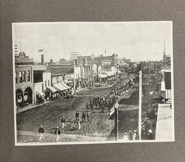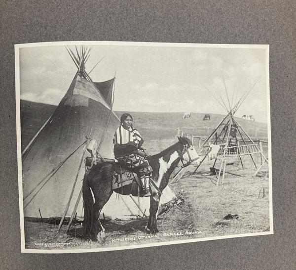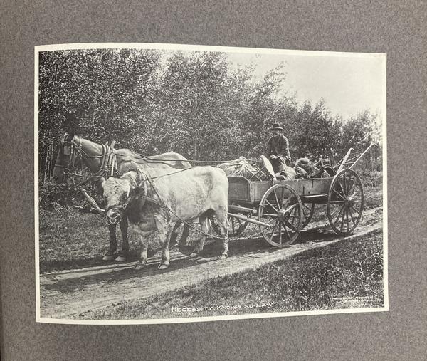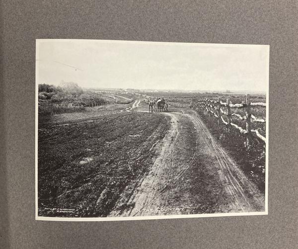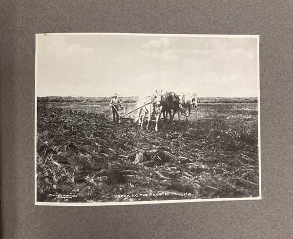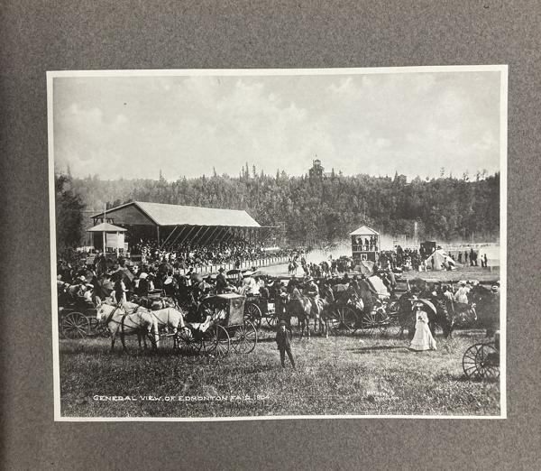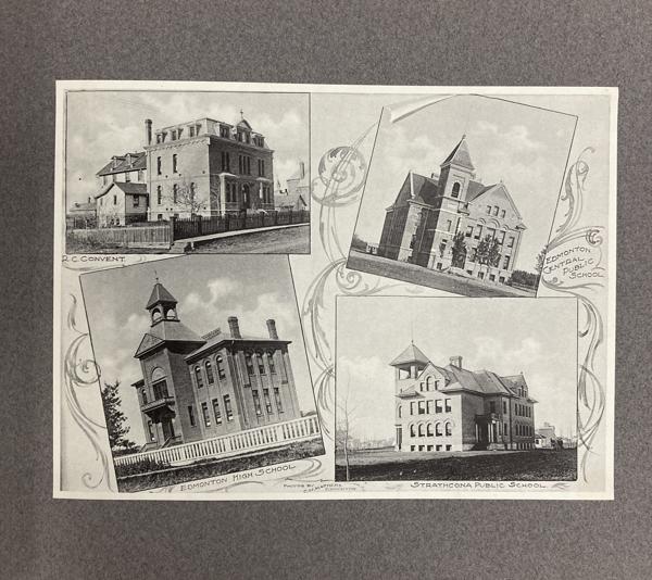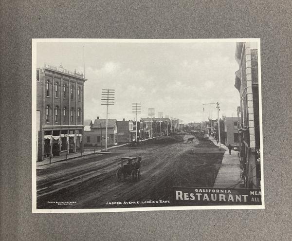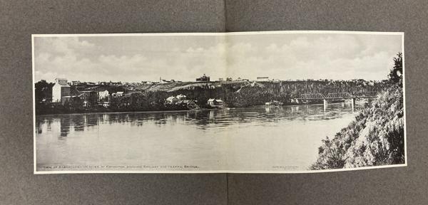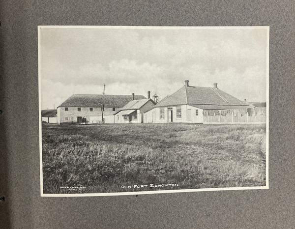 9 1/4" x 11 1/4" in grey paper wrappers with title in white ink, 4 1/2" round photograph of a country scene glued to cover and tied at spine with cord. A collection of forty-two photographs of Edmonton, glued directly to pages. All pictures are 5 3/4" x 7 3/4," black and white photographs. Also includes one 5 3/4" x 15 1/2" black and white panorama photograph of Edmonton at front of collection. All pictures offer description printed at bottom in white ink along with with C.M. Mathers. Collection includes street scenes, schools, hospitals, churches, Old Fort Edmonton, and various residences. Also shown are a steamboat on the Saskatchewan, coal miners, gold washing, a plowman, Red River cart, and other scenes of country life. A few photographs highlight the fur trade and Indigenous peoples, including a fur sorting room, sled dogs, and Cree and Sarcee people posing for photographs. Born in Lucknow, Ontario in 1868, Charles Wesley Mathers moved to Edmonton in 1891. One of the earliest photographers in Edmonton, Mathers not only photographed the growing city but life in other parts of northern Canada at the turn of the 20th century. In 1901 he accompanied William H. Connor, an independent trader from Edmonton to the mouth of the Mackenzie River and along the river routes of the Northwest Territories. Mathers documented his trip, photographing hunting and trading activities for a souvenir album called "The Far West." Mathers passed away in California in 1950. Edges of wrappers and spine are chipped. Pages lightly worn from handling, but pictures are fine.