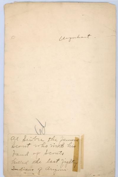 10 7/8" X 7" platinum print photograph of Al Sieber, the famous Army scout and Indian fighter. A period piece of paper that was taped to the reverse has since detached. It reads, Al Sieber the famous Scout who with his band of Scouts killed the last fighting Indians of Arizona." Albert "Al" Sieber was born February 27, 1843 in Mingolsheim, Baden, Germany. He was the 13th of 14 children born to Johannes and Eva Katharina (Fisher) Sieber. Johannes died in 1845. In 1851 Eva immigrated with her still living eight children (six had died) to Lancaster, Pennsylvania. The family moved to Minnesota several years later. In 1862 Sieber enlisted in Company B, 1st Minnesota Volunteer Infantry, to fight in the Civil War. He was severely wounded at the Battle of Gettysburg and also fought at Antietam and Fredericksburg. After the Civil War, he became a prospector in California and Nevada and then managed a ranch in the Arizona Territory from 1868 to 1871. In July 1871, he was hired as Chief of Scouts by General George Stoneman. He held that position for much of the Apache Wars, participating in Crook’s Tonto (Apache) 1871-1873 Campaign. When the Camp Verde reservation closed, Sieber was told to move the Yavapai and Tonto Apache Indians to the San Carlos Reservation in the middle of winter. He remained employed there and participated in several engagements with the Apache that left the reservation. In the mid-1870s, Sieber adopted Haskay-bay-nay-ntayl, better known as the "Apache Kid," who was a White Mountain Apache scout, and later a notorious renegade. In 1883, Sieber served as General Crook's lead civilian scout when he pursued Geronimo into the Sierra Madre Mountains of Mexico. Sieber stayed on at San Carlos as Chief of Scouts for 13 years. In December 1890 he was fired from his position by Major John L. Bullis. He left and took up prospecting until 1898. On February 19, 1907, while leading an Apache work crew that was building the Tonto road to the new Roosevelt Dam site, Sieber was killed after a boulder rolled on him during construction. He was buried with military honors at the Globe Cemetery in Globe, Arizona. He is memorialized on the Crook monument at Arlington National Cemetery. Sieber has been portrayed in a number of films including the 1953 film, "Arrowhead," where he was played by Charlton Heston; the 1979 film, "Mr. Horn," where he was played by Richard Widmark ;and the 1993 film, "Geronimo: An American Legend" where he was played by Robert Duvall. He is the subject of a book "Al Sieber, Chief of Scouts." written by Dan L. Thrapp and published in 1964, by the University of Oklahoma Press. Small loss at three corners with a tiny (1/4 inch) horizontal closed tear at the upper left edge and two small pinholes are also present at the bottom left edge, else a very good copy that is suitable for framing.