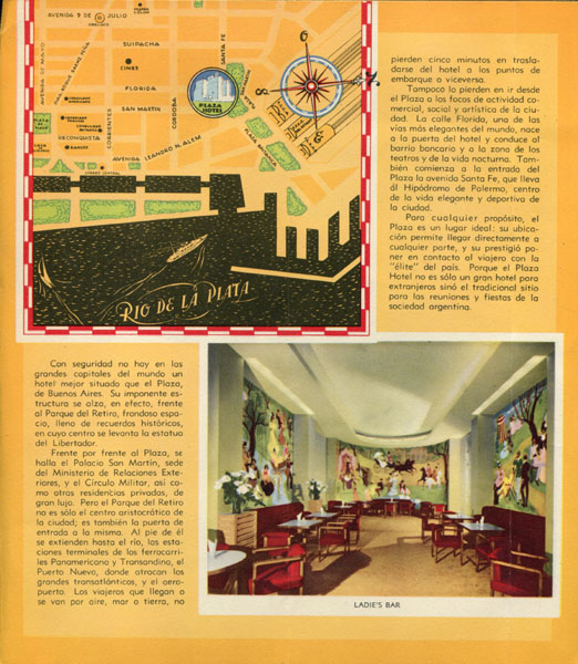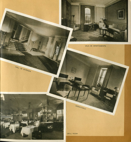 9" x 23 1/2" sheet folded to 6 panels, each 9" x 7 3/4." Text in Spanish. cover panel offers a color illustration of the exterior of the hotel; 1 panel offers color illustrations of interior rooms in the hotel; and 1 panel offers a small street map showing the location of the hotel and with information about the hotel. Opposite 3 panels offer sepia-colored photographs showing the interior rooms in the hotel. 2 vertical folds ... one at center and light fold at edge along with light wear to the extremities.