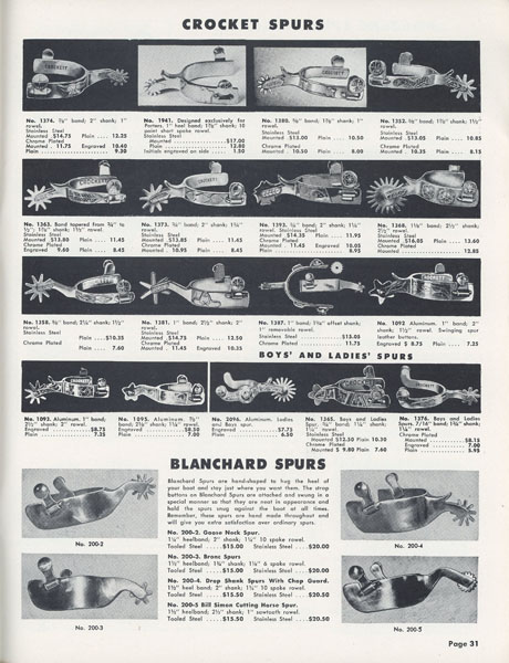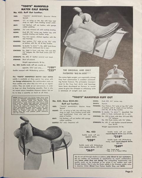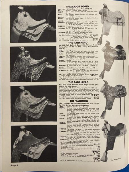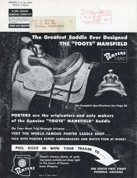 First edition. 8vo. Original 8 1/2" x 11" pictorial wrappers, 40 pp. including covers, illustrated from both photographs and drawings, index. This well-illustrated saddle and tack catalog from one of the most important makers of western harness and saddlery in the world from the 19th through the 20th Century. Founded in 1875 in West Texas, the company opened a shop in Phoenix, AZ around 1898, and even set up a shop for a time in the Washington Territory in 1888. The company became well known for their quality saddles and gun leather, and built and presented the trophy saddle to Lee Anderson in the late 1920’s at the Tucson Rodeo which would serve as the predecessor to the modern roping saddle. This excellent catalog illustrates the offerings of the famed firm of western gear and horse equipment to the ranching interests and working cowboys, and celebrities after World War II during the height of the Mid-Century Western craze. The catalog includes Stock Saddles -- many of them elaborately tooled, some unadorned working saddles, Mexican Stock Saddles, saddle stirrups, saddle blankets, Porter chaps, Porter tack, Crockett bits, lariats, Crocket & Blanchard spurs, along with holsters and tooled belts. Former owner's mailing label affixed to the top edge of the rear cover, covers lightly rubbed, internally clean and a near fine copy.