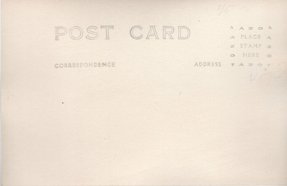 3 1/2" x 5 1/2" black and white postcard. Postcard shows a picture of a policeman sitting astride his motorcycle that has an empty sidecar attached. Stamp Box offers the initials "AZO" with 2 triangles facing up and 2 triangles facing down. Postcard has has tiny bump to bottom corner, else fine.