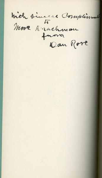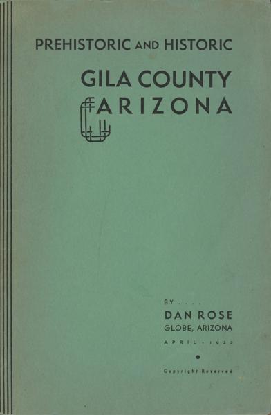 First edition. 8vo. Inked presentation inscription by Dan Rose on the verso of the title page. Stiff green printed wrappers, titles printed in black, 37 pp., preface. Dan Rose's history of and stories of the Globe area of Gila County, Arizona. This booklet, first published in Globe, Arizona, in April, 1935, was privately printed for the author by Republic and Gazette Printery, Phoenix. Included are sections or material on: King Woolsey; the Pinole Treaty; the Massacre at Bloody Tanks; Honky Dory Holmes; the first mine location in Globe; the first merchants in Globe; the first Xmas tree in Globe; pioneers from Silver City, New Mexico; the law in Globe; stamp mills; stage lines; McMillanville; the Middleton Ranch Massacre; the first ranchers; the Apache Kid; Apache raids; Jhu; mine promoters; the lynching of Hawley and Grimes; the Pleasant Valley Feud; the transition from silver to copper; the first railroad to enter Globe; Roosevelt Dam; mineral districts; and Miami. Six Guns says "Rare" and "Contains material on the Tonto Basin War, the Apache Kid, and other Arizona outlaws." This edition is not to be confused with the facsimile re-issue that was published in 1995 and limited to 150 copies.