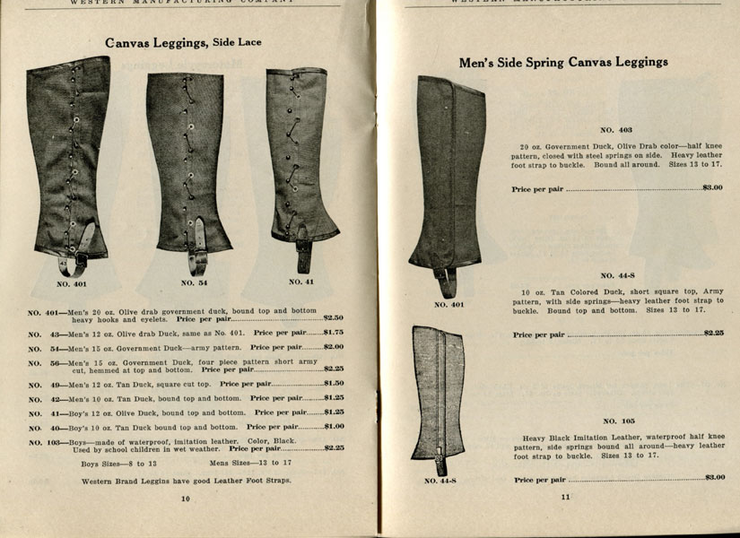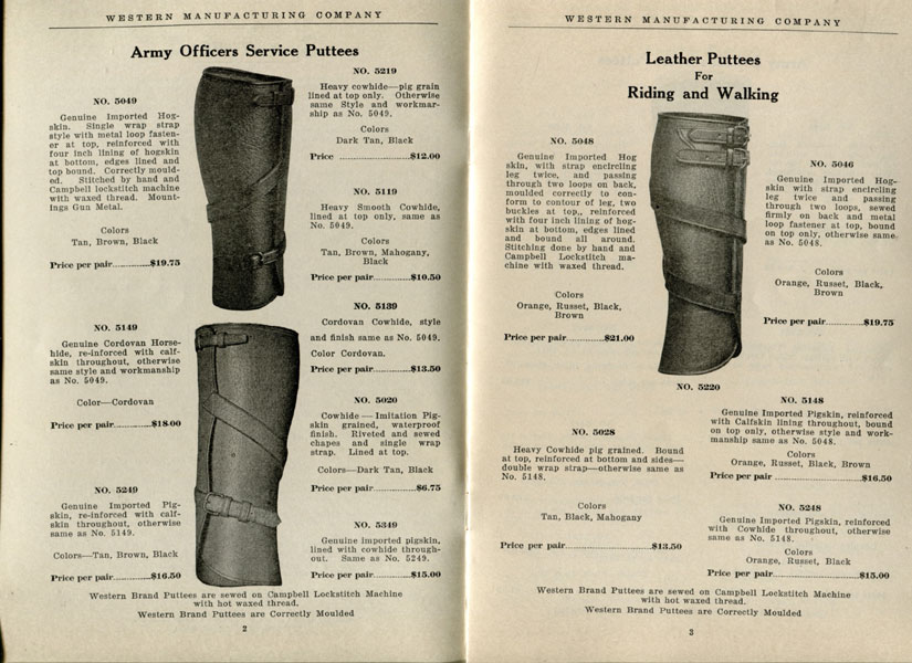 First edition. 9" x 6" in brown pictorial wrappers showing an illustration of a puttee and legging. Title and border in orange ink. 15pp. Illustrations. Western Leather Company was a US Government Quartermaster's contractor from 1914 thru World Wars 1 & 2, Korean War, and into the Vietnam War.. During that time they manufactured holsters, belts, leggings, and assorted GI pieces of leather and canvas. This pamphlet offers 15 pages of officer, aviator, motorcycle, women's, and civilian canvas leggings & leather puttees. Description, colors offered and pricing for each piece. Light soiling to very top edge of all pages else near fine.