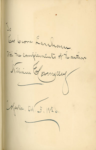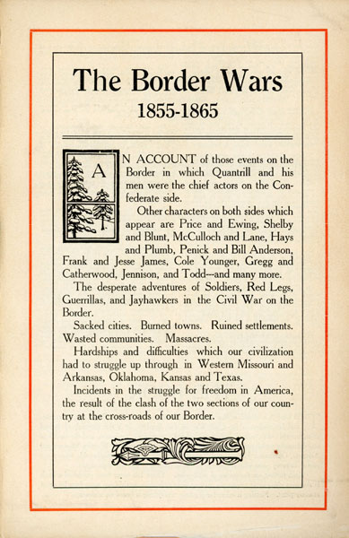 First edition. 8vo. Inked presentation from Connelley on the free front fly leaf. Laid-in to this copy is the original prospectus for this book. Red cloth, 539 pp., + 2 page errata at end. Numerous illustrations and maps, index. An outstanding study of William Clarke Quantrill and the famous "Border Wars" in Kansas and Missouri in the 1860's. With the outbreak of the Civil War, Quantrill joined the Confederacy and fought at Lexington, Missouri. Preferring guerilla tactics, he organized his own gang of southern sympathizers. Although he failed to receive any Confederate endorsement or direct support, he and his men raided communities supposed to have Union sympathizers and robbed mail coaches. They frequently murdered citizens who were suspected of being Union sympathizers. In 1862, Quantrill and his gang were declared outlaws by Union officials. Quantrill helped Confederate troops capture Independence, Missouri in August, 1862. A year later Quantrill, with 300 men plus another 150 men who were loosely allied to him descended on Lawrence, Kansas, burning much of the city down and killing nearly 150 citizens. A few weeks later, after defeating a small group of Federal soldiers at Baxter Springs, Kansas, Quantrill put the Federal prisoners to death. Quantrill was finally mortally wounded in 1865 by Federal troops during a raid into Kentucky in which he led only 33 men. Many later outlaws rode with Quantrill during those violent years. Frank James, Jesse James, Cole Younger, and other noted outlaws are among them. Covers lightly rubbed, a few pages carelessly opened at the fore-edges, else a near fine copy in a bright, fresh dust jacket with a tiny chip and closed tear at head of spine reinforced on the verso with a very old piece of transparent cellophane tape.