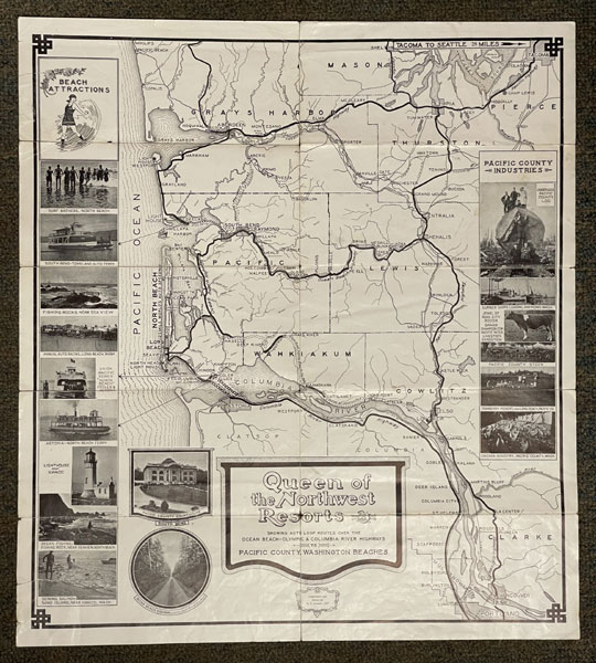 First edition. 18" x 20" sheet folded to 20 panels, each 9" x 4. 2-panel self covers showing a scene of bathing beauties and printed in green and black. 2-panels with information on, The World's 25 Mile Speedway at Long Beach, Washington. Remaining panels with general information about the area to include info on agriculture, nature, sports, lumber, birds and flowers, transportation population, the fish industry, etc. Includes photos of bathing at Tokeland Beach, streets at Ilwaco, the fish hatchery in Chinook, the huge lumber mill in Raymond, as well as the South Bend waterfront. Opposite 10 panels offers a map entitled "Queen of the Northwest Resorts. Showing Auto Loop Routes Over the Ocean Beach-Olympic & Columbia River Highways to Pacific County, Washington Beaches." When the map was drawn and printed there were sections of the state highway on the Washington side which were still gravel and unimproved, and it marks as well the areas where ferries were needed for crossing. Surrounding the map are photos of various Pacific County industries and beach attractions. Splitting at folds along with wear to edges and 2" closed tear to head of front panel. A rare and wonderfully done Jazz Age brochure promoting the many recreational activities at the beaches in Pacific County, Washington during the 1920s.
