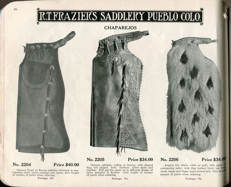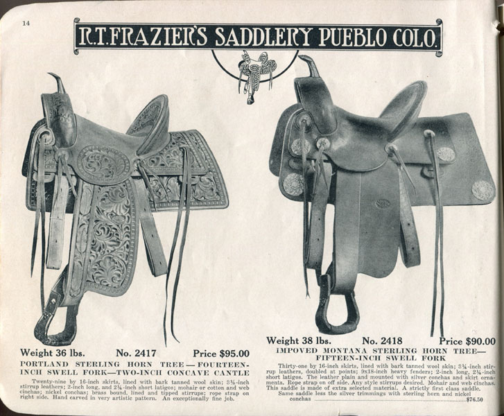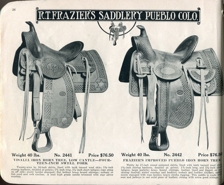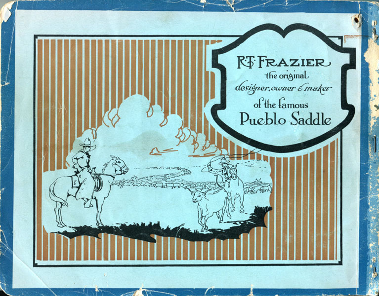 First edition. 8vo. 21.5 x 27.7 cm [8 1/2" x 11"] oblong, color, stapled wrappers, 144 pp., illustrated, index. R. T. Frazier was the original designer, owner, and maker of the famous Pueblo Saddle. There are illustrations depicting their show rooms, as well as all types of saddles, saddle horn trees, saddle pockets, tapideros, stirrups, riding bridles, holsters, cartridge belts, chaparejos, cinchas, blankets,cuffs, belts, hand bags, brief cases, portfolios,, spur straps, etc. Also they advertise hats, shirts, work and dress shoes, cowboy boots, gloves, all types of spurs including silver mounted steel spurs, silver inlaid and plain spurs, inexpensive spurs, steel bits, rowels, buckles, truck and truck farm harnesses, collars, traveling bags, suitcases, etc. A catalog full of items for the cowboy and ranch. Small scrape to front cover that affects the word "catalog," verso of front cover reinforced with old cellophane tape, plus small cellophane tape reinforcement to the first four pages, a hole at the top of spine whereby this catalog was hung, light wear to the fore-edges of the front and rear covers, with the interior clean and tight for an overall very good copy.