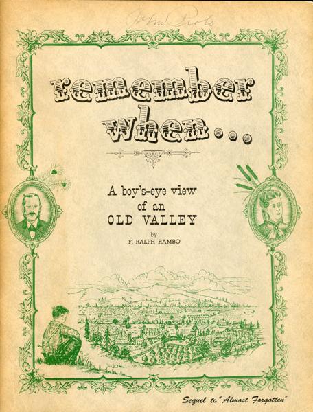 First edition. 8vo. Color pictorial , stiff wrappers, 56 pp., preface, acknowledgments, double column, illustrated, epilogue. Written mostly about San Jose, California, a collection of boyhood reminiscence and nostalgia beginning in 1908. Very good tight and clean copy.