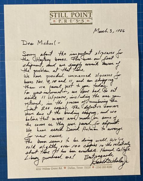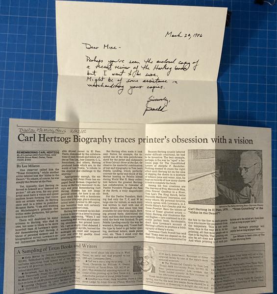 First edition. 4to. Limited to 300 copies of which this is number 10. Two-tone quarter cloth and boards, Hertzog's logo stamped in gilt on the front cover and titles in black on a small paper spine label, as issued, [6], 46 [3] pp., illustrated from photographs. An interesting study of the creative genius of the printer from El Paso. Enclosed in this copy are two letters from the Still Point Press publisher to a well-known bookseller about problems with the original slipcase. else a fine bright copy in the original matching slipcase.
