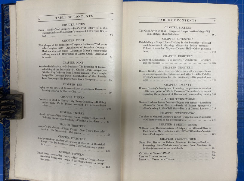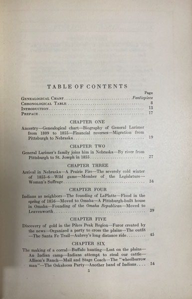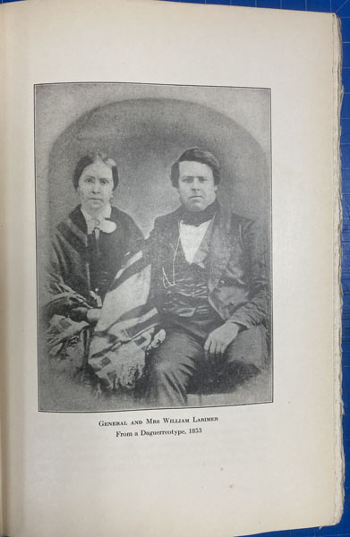First edition. 8vo. Two-tone quarter leather and marbled paper over boards, marbled front and rear endpapers, 256 pp., top edges gilt, genealogical chart, chronological table, introduction, preface, illustrated from photographs, portraits, list of illustrations, index to names and topics. Larimer left a position of influence and comfort in Pittsburgh to become a pioneer in the West. Howes L 102 says: "Larimer was among the earliest Pike's Peak adventurers, and one of the founders of Denver." "General Larimer lost his large fortune in the depression of 1854 and started life anew in Nebraska, leaving his wife and nine children in Pittsburgh. Late in 1855 they joined him in La Platte, a town above Omaha founded by the General. In the fall of 1858, the General, his son W.H.H. Larimer, then not quite 18 years of age, and four others made the overland journey from Leavenworth, Kansas, by way of Bent's Fort to the new gold discoveries at Cherry Creek. Arriving at Cherry Creek on November 17, 1858 the General a few days later founded the Denver City Town Company. The son's narrative tells of these journeys and the founding of Denver by his father and life there until the Civil War. From page 210 to 237 the editor tells from family letters of the Civil War services of the General and his son and of the General's death in 1873. Ordinarily reminiscences are inferior to day by day contemporary accounts, but these are so skillfully edited and so buttressed by contemporary letters and extracts from note books that they form one of the best accounts of an overland journey across the plains and perhaps the best account of the founding of Denver and of life there for the first few years that we have" - Streeter. Rare. Printed in a small edition for private circulation by William Larimer Mellon." Bookplate of former owner on front and rear pastedown sheets, some light cosmetic restoration to the head of spine and corners, lightly rubbed on fore-edges, else a very good copy. Bookplates are for Herman Stearns Davis and Clark Secrest, who retired in 2001 as an editor with the Colorado Historical Society. There he researched and wrote numerous articles for the society's quarterly journal "Colorado Heritage."