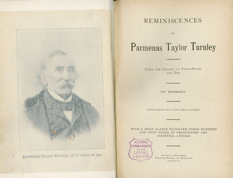 First edition. 8vo. On front sheet are the inked words "Limited to 250 copies and privately distributed." Inked gift inscription and signed and dated by the author in 1894. Maroon cloth, designs stamped in blind on front and rear covers, titles stamped in gilt on spine, decorated front and rear endpapers, 448 pp., introduction, preface, frontispiece (portrait), illustrated from plates. The author first relates army experiences with Harney's Sioux Expedition of 1855. During the next five years he was variously stationed at Fort Bridger, Salt Lake City, and other western posts. Michael Walsh of Goodspeeds considered this work as rare in 1938. Flake 9057 says "Trip through Salt Lake City in 1858, and an account of the rise of Mormonism." This copy has a printed broadsheet issued by Turnley to promote his book tipped-in, plus a leaf of contents is inserted which is not found in all copies. An ex-library copy with spine label, a few light library stamps, and a bookplate of the "Military Order of the Loyal Legion" affixed to the front pastedown sheet, front hinge starting, light wear to the spine ends and corners, else a very good copy of a rare book.