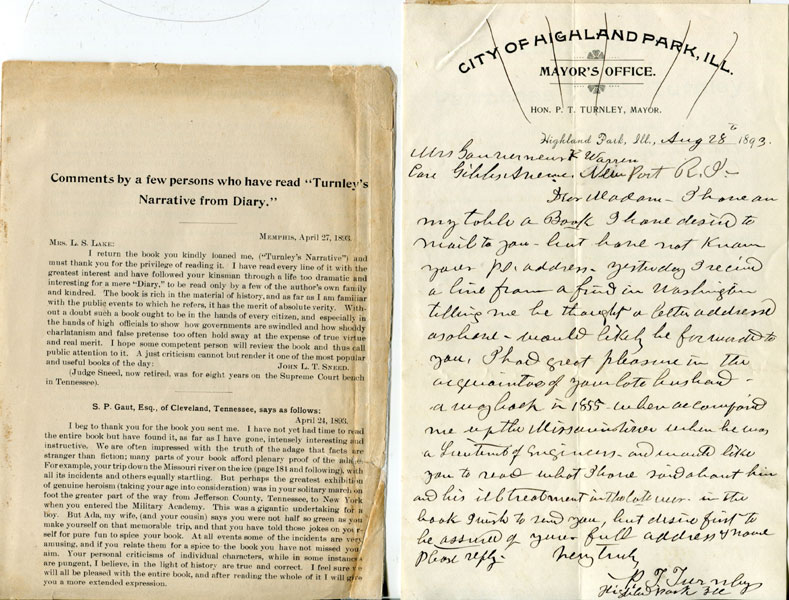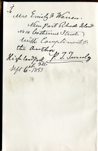 First edition. 8vo. Inked presentation inscription and dated from the author on the front fly leaf. Original brown cloth, decorated front and rear endpapers, 448 pp., frontispiece [portrait of the author at age 71], introduction, illustrated, plates. This copy has the extra plates as noted by Howes T429; leaf of contents inserted [not found in all copies with a manuscript correction], plus a six-page printing of comments from readers [the first we have seen]. The author first relates army experiences with Harney's Sioux Expedition of 1855. During the following five years he was variously stationed at Fort Bridger, Fort Randall, Fort Riley, Salt Lake City, and other western posts. During the Civil War he was active on the Union Side, and went on a special commission to Denver, until failing health caused him to be placed on the retired list by President Lincoln in 1863. Flake 9057 says "Trip through Salt Lake City in 1858, and an account of the rise of Mormonism." Michael Walsh of Goodspeed's considered this work rare in 1938. Tipped in to this copy is a printed broadsheet issued by Turnley to promote his book. Near fine copy.