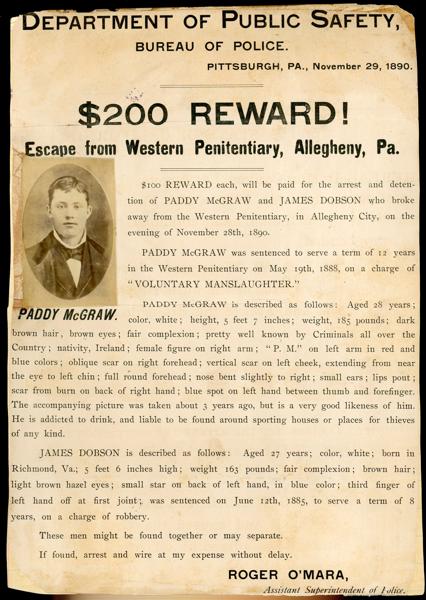 This is a 10" x 7 1/4" reward posted that is pasted onto a piece of cardboard with the message: $200 REWARD! ESCAPE FROM WESTERN PENITENTIARY, ALLEGHENY, PA. "A $100 REWARD each, will be paid for the arrest and detention of PADDY McGRAW and JAMES DOBSON who broke away from the Western Penitentiary, in Allegheny City, on the evening of November 28th, 1890."