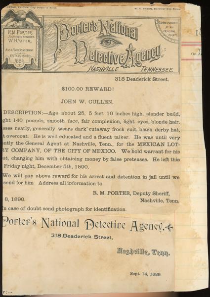 A complete description of Paddy McGraw and James Dobson are provided with a picture of Paddy McGraw provided. This appears to be a "mock-up" with all pertinent information typed and pasted on a stiff paper board and then used as a template for producing the needed wanted posters. On the verso is a similar "mock-up" by Porter's National Detective Agency of Nashville, Tennessee offering a reward leading to the arrest of John W. Cullen.