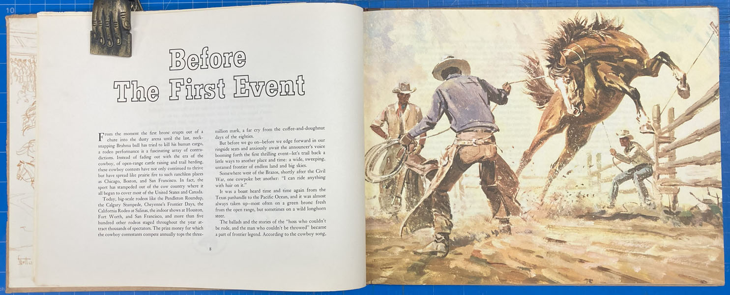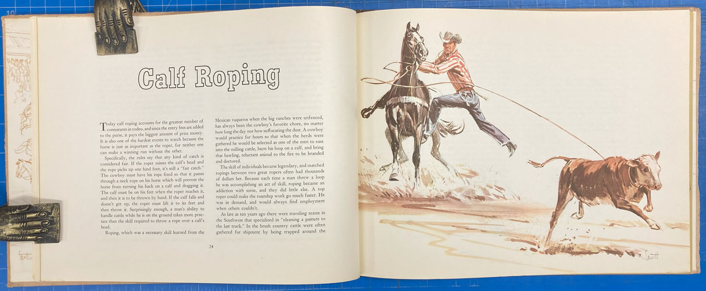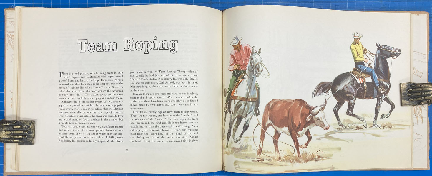 First edition. Oblong 8vo. Quarter cloth and decorated paper over boards, 99 (3) pp., foreword, double column, illustrated in color and black and white. Foreword by Bill Linderman. Real stories about rodeo along with illustrations that clarify the action created. A good copy.