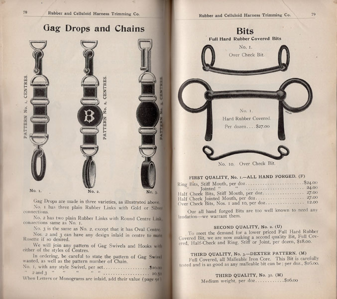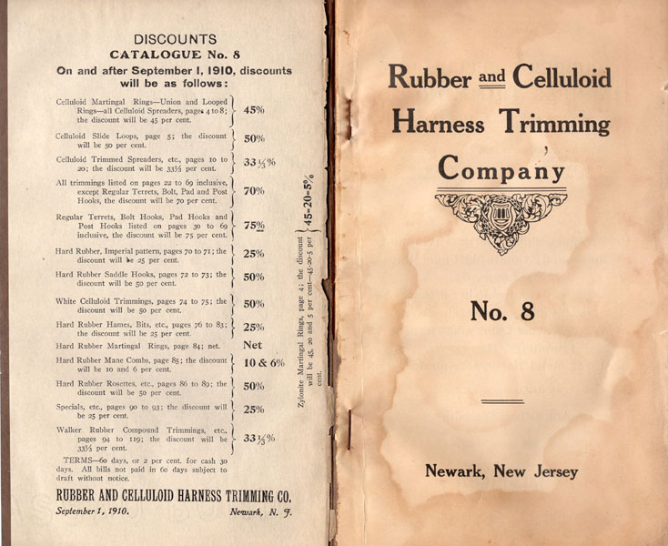 First edition. 8vo. Decorated wrappers, 119 pp., illustrated in black & white. This company manufacturers rubber and celluloid harness trimmings, celluloid martingal rings and slide loops, rein spreaders, face pieces, rubber compound harness, trimmings, hames, light metal harness trimmings in gold, silver and nickel, humane bits, and other specialties for the horse. All goods bear the Albright Trade Mark. Laid-in is a sheet providing discounted prices from the catalog. An old water stain on the title page that diminishes and is hardly noticeable after page 8, tiny nick to the fore-edge of first ten pages, tiny closed tear to the fore-edge of title page, else a very good copy of a trade catalog of accessories for the horse.