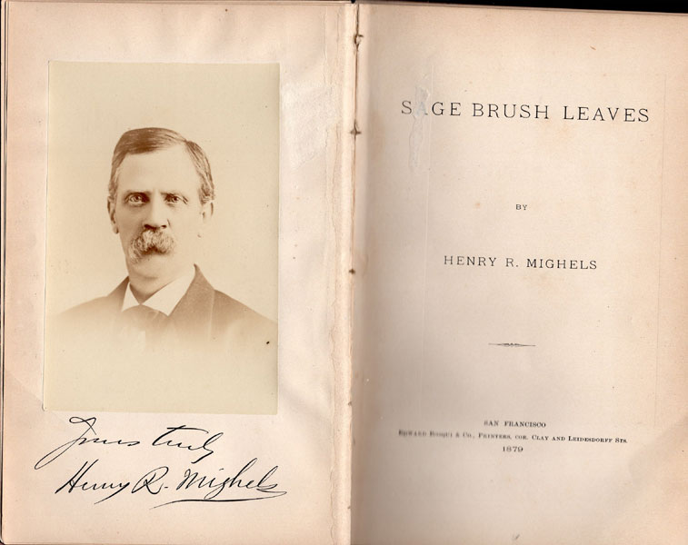 First edition. 12mo. Original brown cloth, dark brown front and rear endpapers, titles stamped in gilt on the spine, [6], 335 pp., albumen photograph frontispiece with facsimile signature below. A posthumous collection of essays, letters, and notes by the popular Nevada journalist and editor of the CARSON APPEAL. Henry Mighels died in 1879, just shy of fifty years of age, and his widow published these writings in order to defray his medical and funeral expenses. Born in Maine, he came to California in 1851 and after a time began a long career as a journalist and editor, with a return to the East for Civil War service, followed by a decade in Nevada, where he edited the APPEAL and dabbled in state politics. Included are Mighels' writings on politics, mining, the Chinese question, an 1877 trip from Carson City to Lake Tahoe, and a concluding section of his letters from the French Hospital in San Francisco in 1878. A selection of "Letters from Lake Bigler," were written during a stay at Lake Tahoe in 1877. This copy bears the bookplate of Catholic priest and noted book collector, Joseph M. Gleason. An ex-library copy with evidence of a label removal from the spine and two ink stamped numbers (on copyright page and lower margin of one text page). Former owner's bookplate on front pastedown sheet, cloth lightly rubbed and light wear to spine ends, else a very good copy.