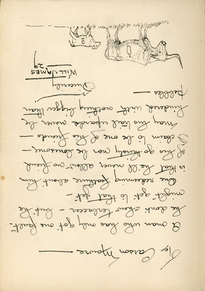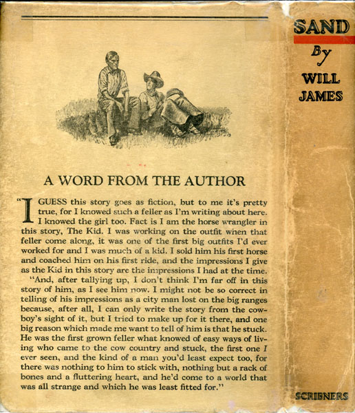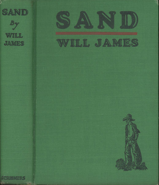 First edition. 8vo. Inscribed on the front free fly leaf : "To Carson Mowre - / A man who has only got one fault - / he don't chew terbaccer - but he / might get to that yet - / One redeeming feature about him / is that he'll never allow no friend / of his go thirsty nor be lonesome - / I claim to be one of his friends - / May his trail upards never be / hindered with nothing bigger than pebbles - / Sincerely / Will James '29 " Beneath the inscription is a branded longhorn steer and a calf. Green cloth, titles and decoration stamped in black on the front cover and spine, x, [2], 328 pp., numerous illustrations by Will James. The drawing on the dust jacket, according to Frazier in his bibliography of James Books says, "The one very wonderful black-and-white drawing on the dj is not repeated in the book, so if you want all 48 of the separate Will James drawings and sketches in SAND you have to get the first edition in dj." Book covers with minor rubs to the spine ends, else a fine bright copy in a lightly used dust jacket with two faint crease marks to the lower front front panel, spine a bit darkened, and light wear to the corners and extremities. An attractive copy.