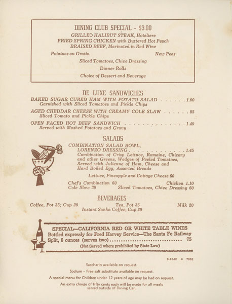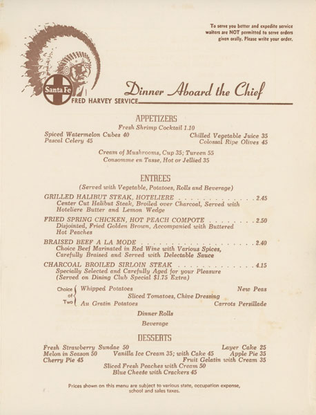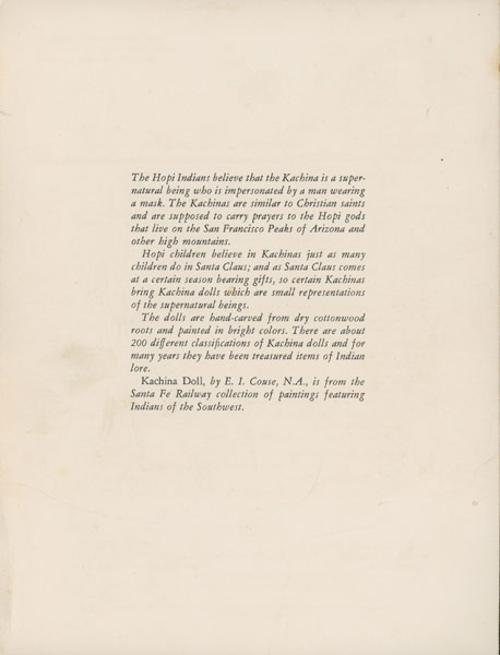 First edition. 9 3/8" x 7 1/8" color pictorial wrappers, n. p. (4 pp.), front cover illustrated with a color picture of the Kachina Doll by E. I. Couse. Interior two pages provide dinner service menu suggestions aboard the Santa Fe Chief with Fred Harvey service. The rear cover is a brief sketch about how the Indians hand-carved the Kachina Dolls from dry cottonwood roots and painted them in bright colors. Covers lightly soiled else a very good copy.