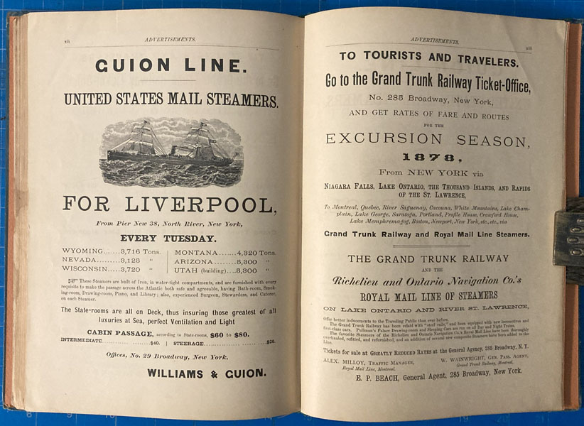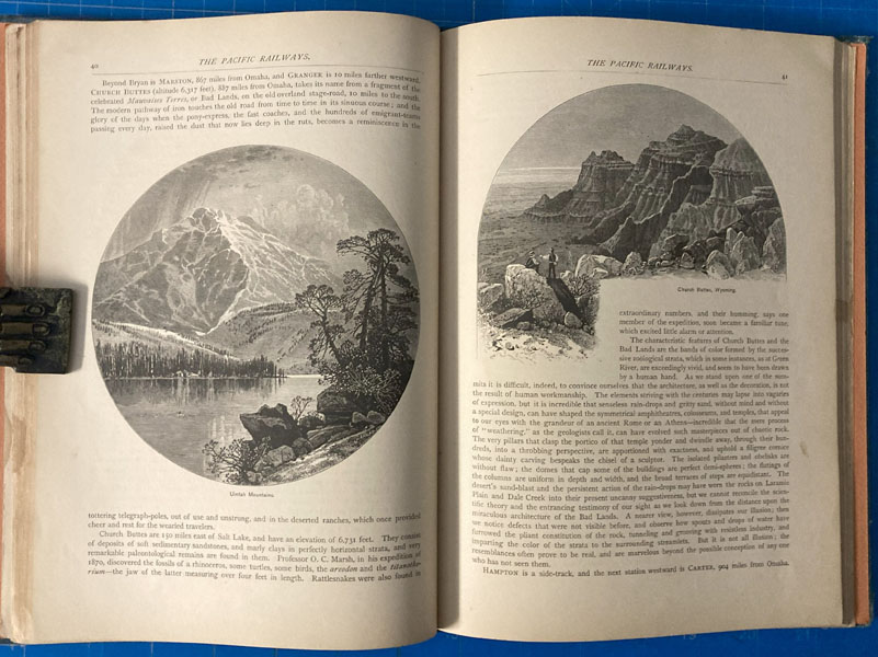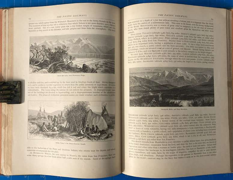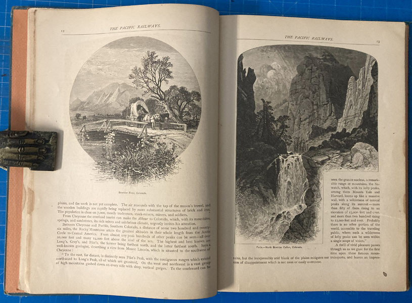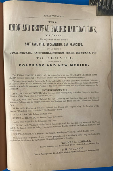 First edition. 8vo. Green cloth, titles stamped in gilt on the front cover, [iv], [2], 88 pp. plus [v -xvi] advertisements, frontispiece [map of the Pacific Railways], illustrated, advertisements. An uncommon book that offers beautifully illustrated descriptions of natural and man-made points of interest accessible to passengers traveling on the Central and Union Pacific railroads from Omaha to San Francisco. Numerous attractive views in Nebraska, Wyoming, Utah, etc. with much emphasis on Colorado and California. A tiny old water stain to the fore-edge of most pages and fading away to nothing, Some light pencil markings to a few pages, page 13 has a 3" closed tear at the fore-edge, covers lightly rubbed, light wear to corners and extremities, else a good+ to very good copy.
