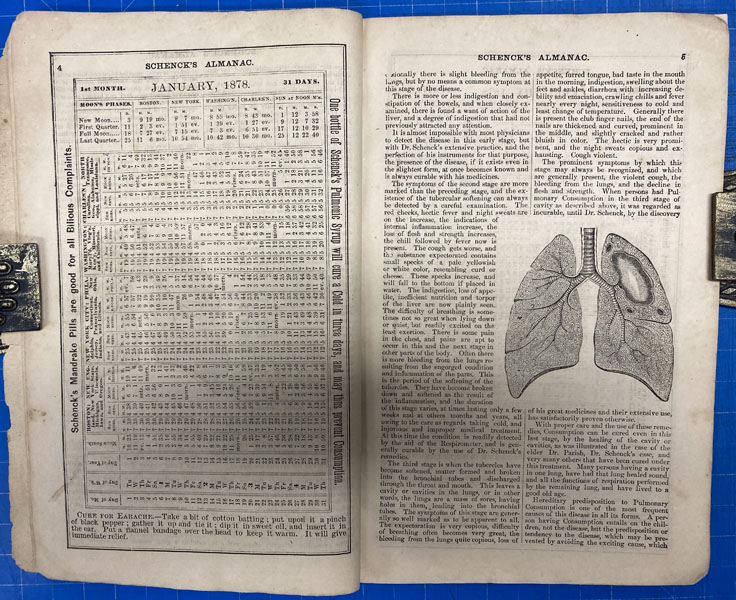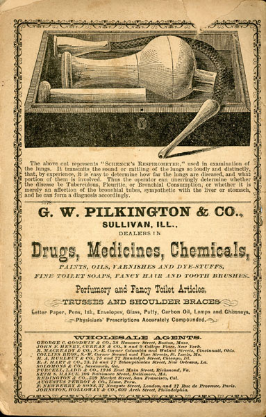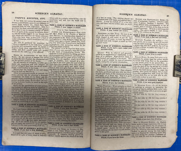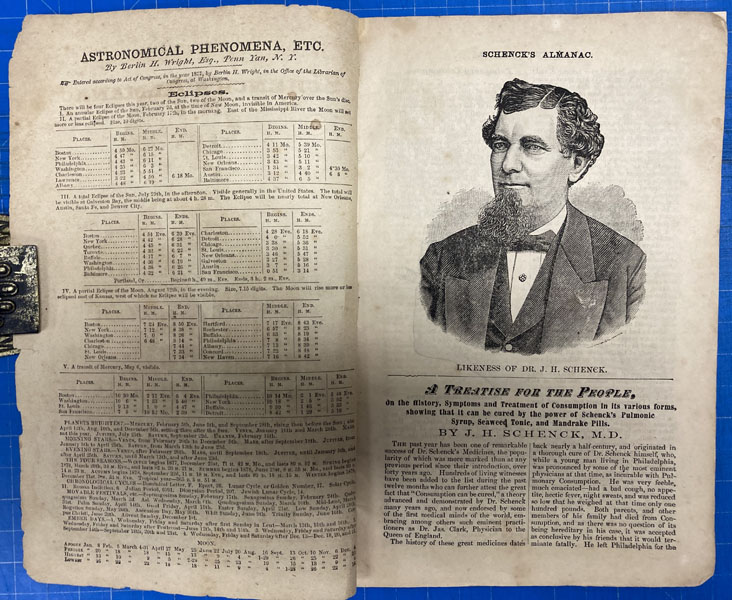 First edition. 8vo. Pictorial wrappers, 32 pp., double column, illustrated from drawings, tables, and a likeness of Dr. J. H. Schenck. Dr. Schenck's business was headquartered at the North-East corner of Sixth and Arch Streets in Philadelphia. The building is pictured on the front cover of the wrapper. He produced pills, syrups and tonics that cured many maladies such as his Mandrake pills are good for all bilious consumption, his Sea-weed tonic cures indigestion, his Pulmonic syrup cures consumption, and many more examples of the healing power of his medicines. In 1875 he published a story titled "The Wild Ranger Of Santa Fe" that also included information on his many health remedies. It was said of the story by a noted biographer : Herd 2019 says "Very rare." "Historically, this is a worthless little pamphlet, but it is a collector's item because of its rarity. Written as fact, it is no doubt fiction and an original means of advertising by a doctor who made pills and cough syrup." Tiny nicks, chips and closed tears to the fore-edges else a good copy.