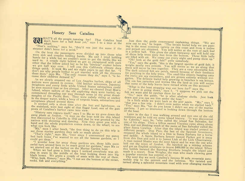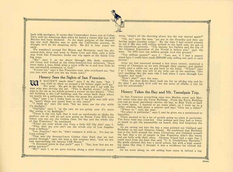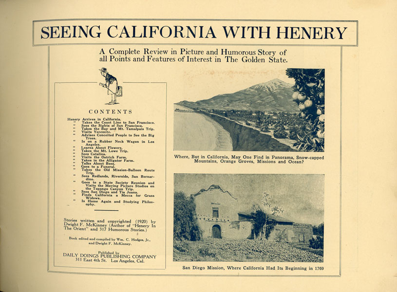First edition. 8 1/2" x 11" in original pictorial die-cut gray over-sized wrappers, printed in black and gilt. Illustrations. Stapled. Contents. Illustrations. A well-illustrated promotional booklet advertising California's popular scenic attractions and tours, with emphasis on Southern California. Includes Henry's trip to Yosemite Valley and the Mariposa Grove of Big Trees. Brief travelogues spiced with early twentieth-century humor of the traveling salesman variety. "'Be sure and take the Big Tree Trip on your way out of the valley,' says a man I met in camp. 'I came in that way. The folders say it's great.' 'Why do you take the folder's word for it when you went over the trip yourself?' says I. 'Well,' says he, 'I met [a] blonde on the stage and I had to read up on the folder when the trip was over to find out what I should have seen.' We took the man's advice and started one morning on the big tree trip" (p. 11). Light tanning to pages along with Light wear and chipping to over-sized wrappers. Very good.