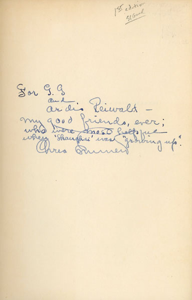 First edition. 8vo. Inscribed by the author on the front free fly leaf: "For G. G. and Ardis Reiwalt - My good friends, ever; who were most helpful when 'Shanghai' was 'growing up.' Chris Emmett." Cloth, xiii, 236 pp., illustrated, plates, portraits, maps, appendix, bibliography, index. Drawings by Nick Eggenhofer. Six Score 38 says, "Pierce was a grand original, the first cattle king of Texas. His business dealings were vast, varied, and interesting." Six Guns 678 says, "There is some material on the Taylor-Sutton feud and on John Wesley Hardin, Jack Helm, Ben Thompson, Wild Bill Hickok, and other gunmen." Light evidence of a small label removal from the front pastedown sheet and the half title page, else a fine, tight copy in dust jacket very lightly sunned on the spine. An exceptional copy.