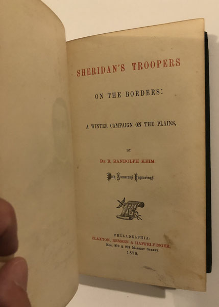 Green cloth, decorated gold stamping on spine, 308 pp., brown endpapers, frontis. [portrait], preface, illustrated. With the U.S. linked by rail from coast to coast, the Indians were alarmed at the encroachment of the settlers. This book details more than six months spent on the Southern Plains, by Major General Sheridan and his actions against the Comanche, Kiowa, Cheyenne, and Arapahoe as the settlers began to invade the Indians' territory. The plight of the soldiers to exist on the plains under hostile conditions, including the severe winter storms, is also told with remarkable clarity. "The author narrates in this work, the incidents of a campaign against the Indians of the Plains, in which the usual military role of fighting the Indians when they were best prepared, was not adhered to. General Sheridan assailed them in the depth of winter, when the resources which make them so difficult to find or overtake were unavailable."--Field 813. Previous owner's small bookplate, stamped name, and name in ink, else an exceptionally nice copy of this very scarce work. Ornate gilt-stamping on spine is bright and unworn.