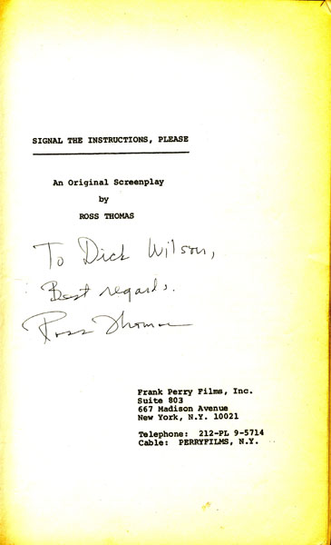 First edition. Inscribed. An original screenplay that was never printed in book form. 133 pages bound in red leather binder. the cover page. the address of "frank perry films, inc." on the same page. 133 pages bound in a red binder by Studio Duplicating Service, Inc. Very scarce.