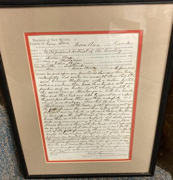 First edition. 12 1/2" x 8" document that has been matted and framed to 16 3/4" x 12 3/4." An important Dona Ana, Territory of New Mexico document dated November 1876. Fascinating content as described by the district attorney : "With force and arms in and upon one Jose Torres .... with a certain pistol called a revolver ...." Document signed in ink at the bottom right by District Attorney W. L. Rynerson. William Rynerson was born on February 22, 1828 in Mercer County, Kentucky. He went to the Franklin College in Indiana and then joined the gold rush to California in 1852. When the Civil War started, Rynerson enlisted in the army and arrived in New Mexico. In November 1866, he was mustered out of the army at La Mesilla and began living in Las Cruces. At this time, he was almost seven feet tall. On December 15, 1867, Rynerson shot and killed the chief justice of New Mexico, John P. Slough in Santa Fe. He was acquitted in court however on grounds of self-defense. On December 22, 1872, Rynerson married Luciana Lemon at La Mesilla. In January of 1876, Rynerson was appointed by Governor Sam Axtell as the district attorney for the Third Judicial District (Dona Ana, Lincoln, and Grant Counties). Being a member of the Santa Fe Ring and now also being a district attorney meant that he now controlled all of Dona Ana County. In June of 1877, Rynerson was the prosecuting attorney of Jessie Evans in Evans's murder trial. Evans was acquitted, and it's highly doubtful that Rynerson ever even attempted to get Evans convicted. In 1878, Rynerson was reappointed as district attorney. He was good friends with L. G. Murphy, J. J. Dolan, and J. H. Riley and helped them all he could in the war. Before the war, he lent Dolan the money he needed to buy a partnership in L. G. Murphy & Co. Rynerson also wrote a letter to Dolan and Riley advising them to simply kill John Tunstall. Towards the end of the war, Rynerson hired the John Kinney Gang (who roamed Dona Ana County) and sent them to Lincoln County to serve as more gunmen for Dolan. After the war, he was "prosecuting attorney" in Dolan's trial for murder, and the charges against Dolan were quickly dropped. It was also primarily because of Rynerson that Billy Bonney never received the pardon promised him by Gov. Lew Wallace. In order for Billy to have received the pardon, the prosecuting attorney (Rynerson) would have to agree to it, and Rynerson intended to prosecute Billy fully. Billy eventually escaped jail because of this and never was pardoned. Rynerson later partnered with Dolan and others to establish a ranch on Tunstall's old property, called the Feliz Land & Cattle Co. He died on September 26, 1893. Three horizontal folds else a fine presentation of a fascinating document.