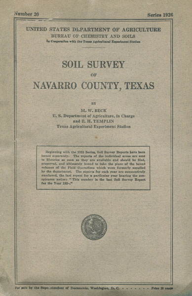 First edition. Printed wrappers, 20 pp., complete with a map, details the type of soil in the county, and points out agricultural products grown along with livestock raised. Very good with the large folding map intact. Cracker Barrel Chronicles 3456.