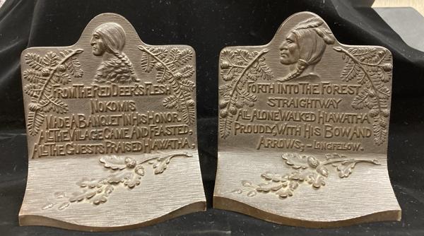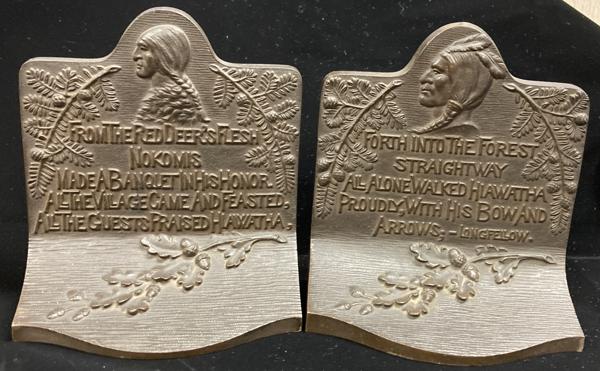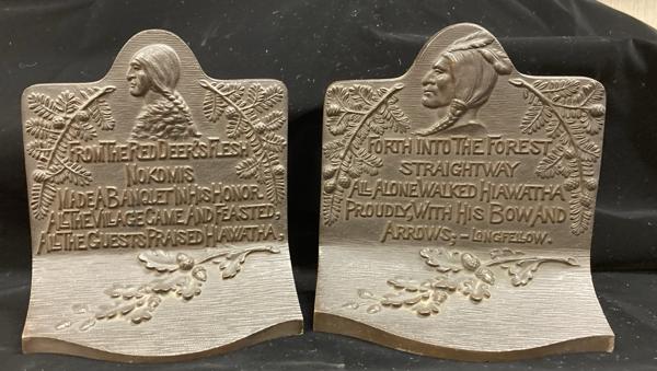 This pair of attractive, well-made and with a rich patina book ends measure 5 3/4" x 6 1/4" x 3 1/8" and weight ten pounds nine ounces. Beautifully designed and sure to provide many years of attractive service. While not identified as such, these bookends are of the quality once made by Greenblatt Studios.