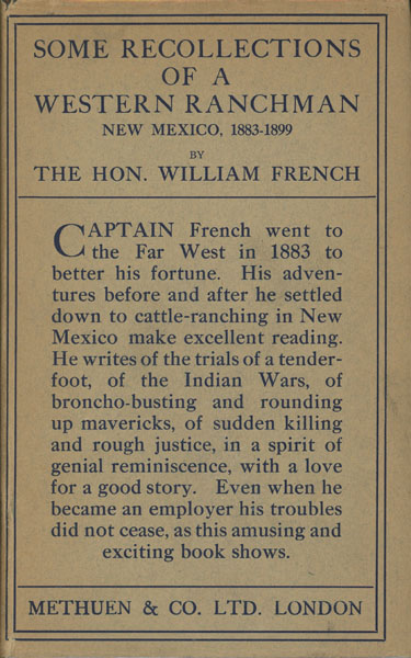 First edition. 8vo. 22.9 x 15 cm. Gray cloth, vi, [2], 283 pp., plus 8 pp. listing of Methuen's general literature. French recounts his experiences as an English immigrant who became a cattle rancher in southeastern New Mexico during the 1880s. He describes the challenges of establishing a ranch near the Pecos River, managing cattle herds, and dealing with the unpredictable New Mexico climate ... ranging from droughts to deadly blizzards. He writes of branding, roundups, cattle drives, and confrontations with rustlers, as well as the social dynamics among ranchers, cowhands, and neighboring settlers. Six Score 42 says "One of the best personal accounts of western ranching. French was an Englishman who owned the WS ranch in western New Mexico. He recounts his experiences with humor and insight." Six Guns 774 says "Information on many western outlaws, such as the Wild Bunch, Joel Fowler, and Black Jack Ketchum. Most of these outlaws worked for the author on his ranch." Herd 847 says "One of the really good but little-known books on ranch life." Lightly foxed at fore-edges, else a fine, bright copy in the elusive dust jacket with light wear to the spine ends and faintly creased to top of rear cover, An attractive copy.