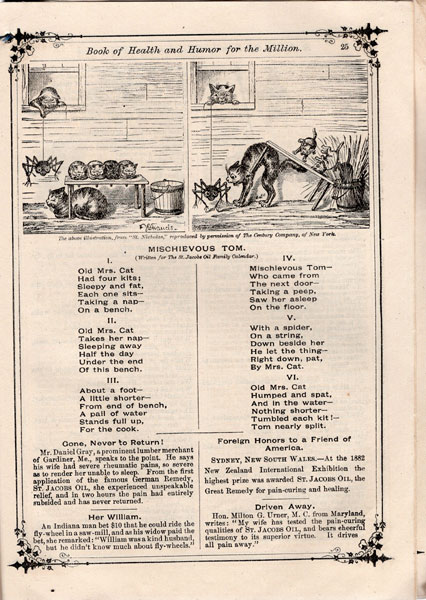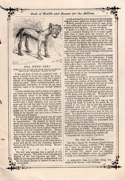 First edition. 8vo. Color pictorial wrappers, 32 pp., double column, illustrated, testimonial references. The primary purpose of the Charles A. Vogeler Company was to manufacture proprietary medicines for human beings and livestock. Several advertisements advise us of cures for pain, sprains, cuts and bruises, rheumatism and backache, swellings and soreness, chafings and eruptions, household accidents, etc. by using St. Jacobs oil at only 50 cents a bottle. The elixir is also available to farmers and horsemen to relieve all types of ailments for livestock. A neat booklet that while promoting the advantages of their product also provides humorous stories and sayings taken from other publications. Stories by Sweet & Knox, in Austin, Texas, editors of "Texas Siftings," Bill Nye, editor of "Boomerang" of Laramie, Wyoming, Joel Chandler Harris of Atlanta, Georgia offers "Constitution," plus many other offerings. Original illustrations in black & white are provided for each story. Covers have a small hole with a string inserted and booklet was hung on the wall for ready reference, covers lightly soiled, three small corner creases to last two pages and rear cover, else a very good copy.