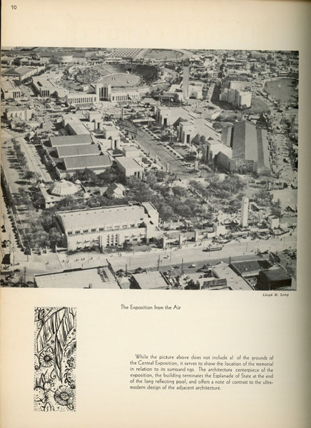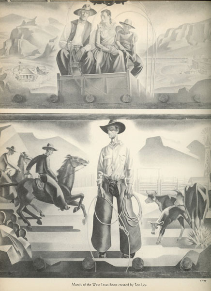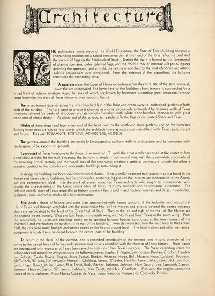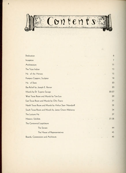Presented by Commission of Control for Texas Centennial Celebrations and the State Board of Control. First edition. 12 1/8" x 9 1/4 in burgundy leather boards with title embossed on front cover i burgundy as well as the Great Medallion of Texas by Joseph E. Renier, printed in gold. 48 pp, contents, illustrations. The Texas Centennial Exposition, June 6 – November 29, 1936, at Fair Park in Dallas, Texas, was a celebration of the 100th anniversary of Texas's independence from Mexico in 1836 as well as a celebration of Texas and Western culture. More than 50 buildings were constructed for the exposition, and many remain today as notable examples of Art Deco architecture. This book presents illustrations and information on the building's architecture; the Texas Indian bronze by Allie Tennant; the Hall of Heroes which contains info on Stephen Austin, Sam Huston, Marabeau Lamar, Thomas Rusk, William Barrett Travis, etc; the Hall of the State with much information on the Great Medallion of the state by Renier and the murals by Eugene Savage; murals of the West Texas Room by Tom Lea; murals of the East Texas Room by Olin Travis; artwork in the North and South Texas Rooms; information on the Lecture Hall and its historical exhibits; et. al. Offers a list of the names of current senators and congressmen. Profusely illustrated and with much information. Light rubbing to spine ends and corners. Very good plus. Nicely produced item.