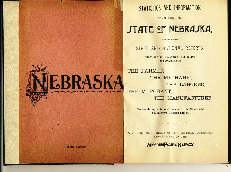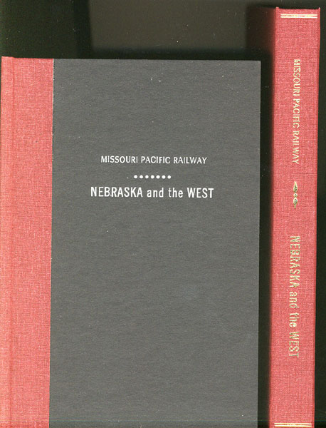 Second edition. 12mo. Stiff printed wrappers, bound into a quarter cloth and boards binder, 64 pp., illustrated, plates, tables, map. A promotional booklet published by the Missouri Pacific Railway to encourage settlement in Nebraska. Information is provided on the history of the state, climate, rainfall, lakes, springs, rivers of Nebraska, population, soil meteorology, churches and schools, grasses, crops, stock raising, sugar beet culture, horticulture, apple crop, poultry and eggs, dairy, tobacco, etc. Distances from Lincoln, Nebraska to any point in the state are provided. The altitudes for towns and cities are given. An interesting population map of Nebraska by counties is of interest. Large folded map of Nebraska affixed to rear cover is in fine condition. A rare railroad promotional housed in a cloth clam shell case with titles stamped in gold on the spine.