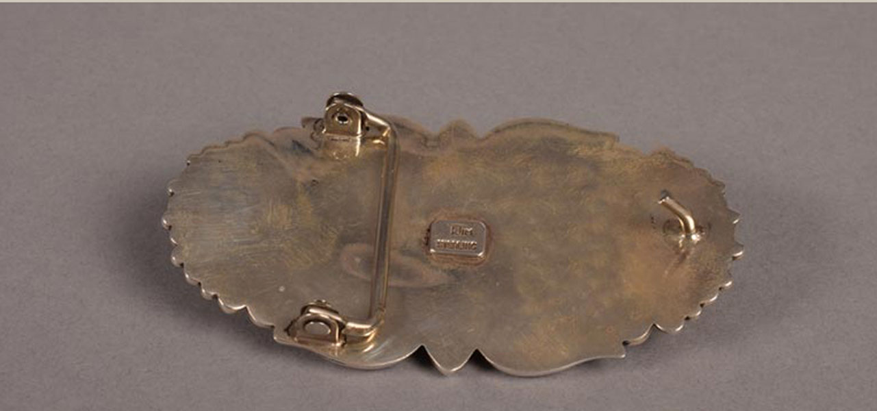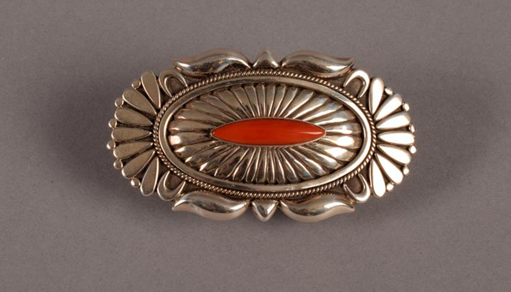 This spectacular 2" x 3 1/2" belt buckle with coral was created by Diné of the Navajo Nation silversmith Thomas Jim. The artist took a beautiful piece of red coral and surrounded it in an elaborate frame of sterling silver. The silverwork accentuates the unique red color of the coral. Jim set the coral in an elegant straight-edged bezel. Radiating from the center are rays of silver encompassed by bands of silver and twisted wire. The outer part of the buckle has added drops of silver and sections of sleek silver elements. The style of Thomas Jim (1955- ) is distinctive in that he uses silver in a manner that creates a sense of movement. He is the recipient of many awards, and his work is shown in many publications including Dexter Cirillo's Southwest Indian Jewelry. The buckle is signed on the back with the artist's hallmark, TJim. The buckle is in excellent condition.