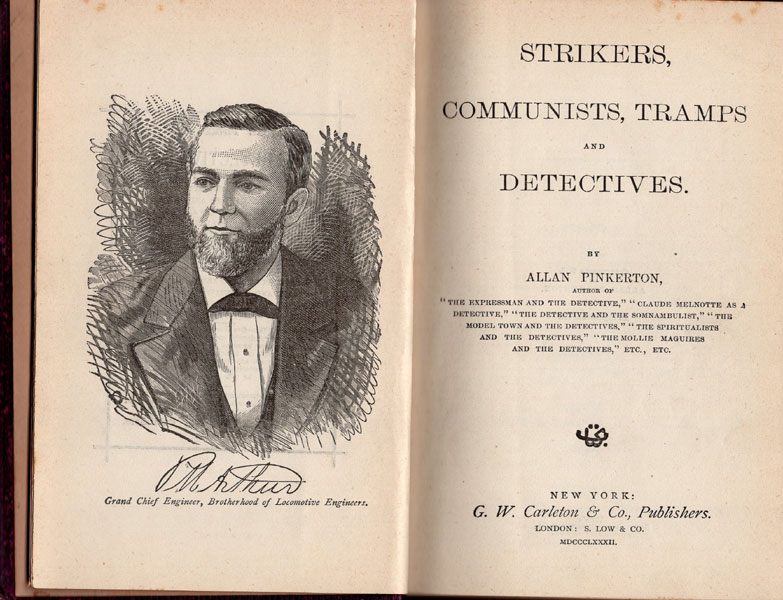 Later edition. Originally published in 1878. Original decorated brown cloth, tan front and rear endpapers, xii -412 pp., plus 8 pp. advertising, frontispiece, preface, illustrated. Light wear to the spine ends and corners, and rear cover lightly rubbed, else a very good copy with the Pinkerton "We Never Sleep" logo on front cover. Written by the man whose company was hired to fight unions, the book details strike-breaking and gives Pinkerton's take on shiftless tramps, rioting strikers, communists, and union brotherhoods.