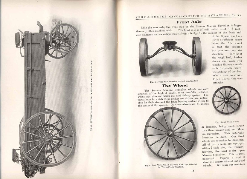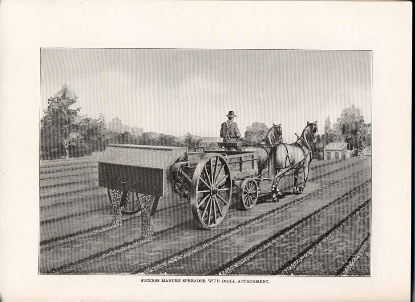 First edition. 9 1/2 x 7" in pictorial wrappers showing a farming scene on front wrapper and a barnyard scene on the rear wrapper. 48 pp. Illustrations. Information about the value of manure, top dressing, the general manure spreader, and the farm as a type of factory followed by information on the "Success" spreader. Offers information on and illustrations and diagrams of the spreader's construction to include the axles, wheels, frame, roller bottom, preventative lever, beater driving mechanism, beater freeing device, the beater, apron movement, adjustable "pulverising" rake, the chains, the three-horse hitch, shafting, the apron, etc. Information on cost, guaranty, and warranty. 2 pages offering varied uses of the "Success." Information on sizes, dimensions, length of axles, extra attachments, etc. 8 pages of testimonials. Wrappers lightly soiled, rubbing to spine and with light wear to extremities. Very good. A very interesting trade catalog.