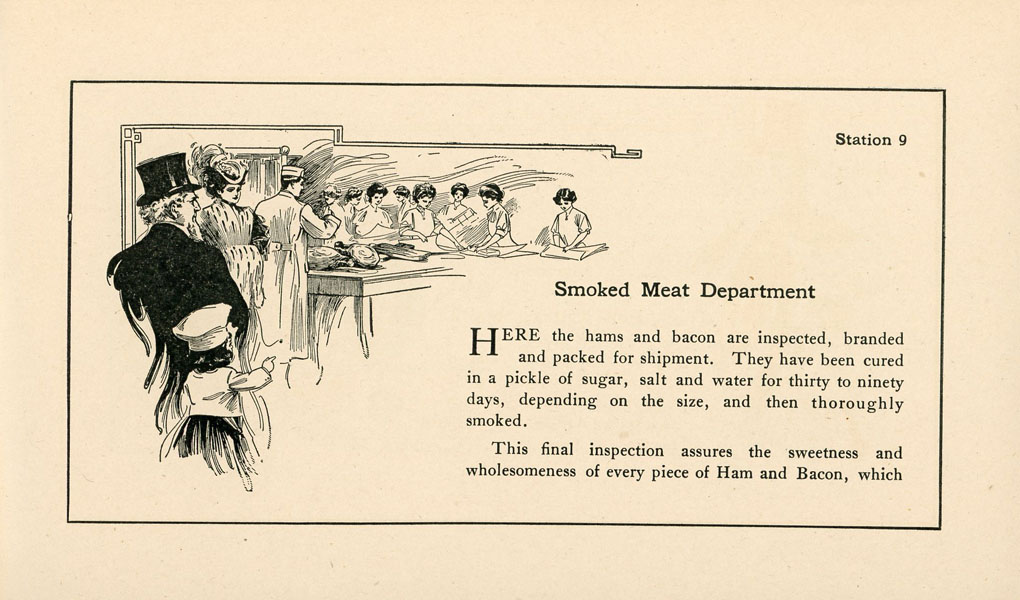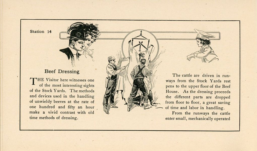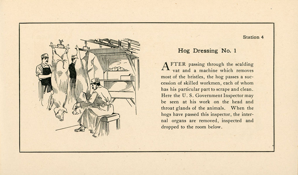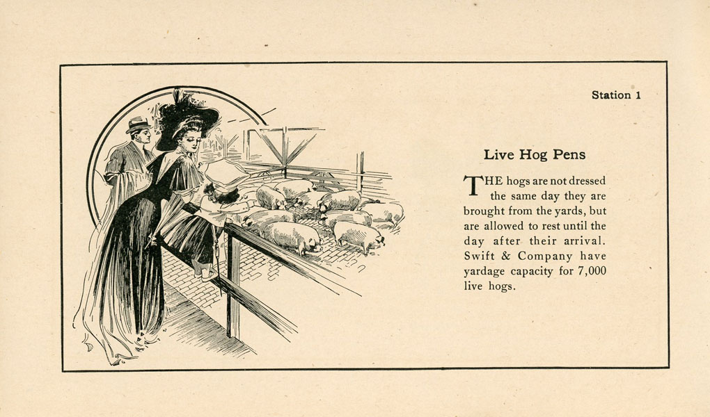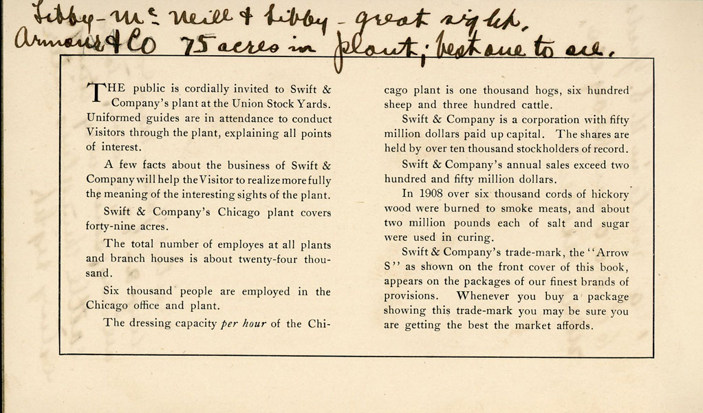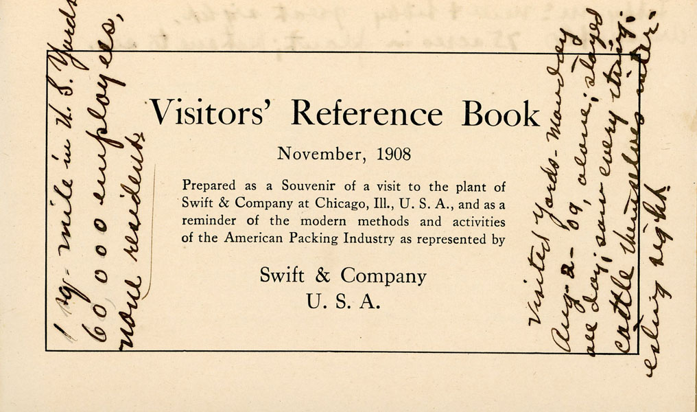 First edition. 4" x 6 5/8" printed stiff wrappers, n. p. (36 pp.), illustrated Inked signature of J. Frank Dobie on front cover. In addition Dobie has added inked comments on the first two pages: "1 sq. mile in U. S. Yards, 60,000 employees, none residents." "Visited Yards - Monday Aug. 2, 09, alone; stayed all day; saw everything; cattle themselves interesting sight." "Libby -McNeill & Libby - great sight, Armour & Co. - 75 acres in plant; best one to see." Apparently Dobie visited the Union Stock Yards in Chicago and made his comments based upon his visits and observations. This booklet was prepared as a souvenir for visitors to the processing plant of Swift & Company in Chicago and as a reminder of the modern processing methods of the American Meat Processing Industry as represented by Swift & Company. The booklet begins in the Hog Department, pork cutting, smoked meat department, the sheep and calf cooler, the beef cooler, sheep dressing, beef dressing, the lard department, the soap factory, etc. In all cases Swift & Company emphasize the care given livestock prior to processing them, the clean and safe conditions for employees, and the absolute care is provided to ensure that all meat for consumption is certified "U. S. Inspected and Passed." In 1906, Upton Sinclair's book "The Jungle" was published and it was an indictment on working conditions and safety in the meat packing industry. This is a well-preserved booklet in near fine condition.