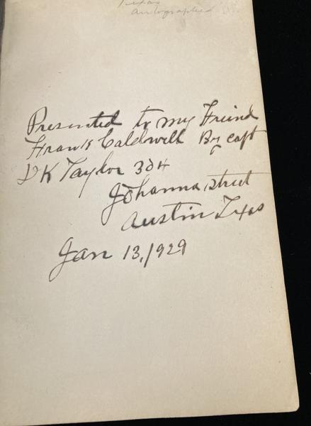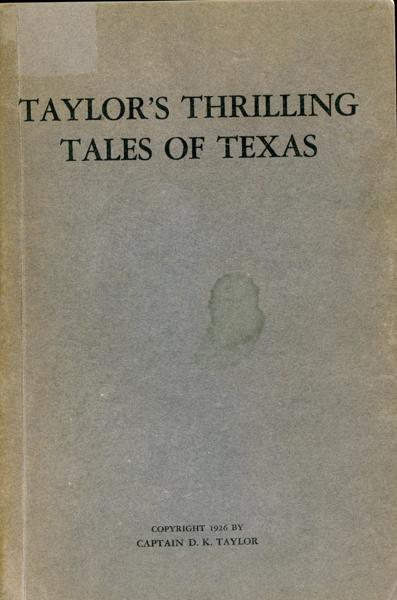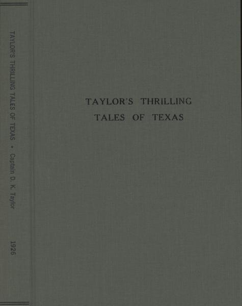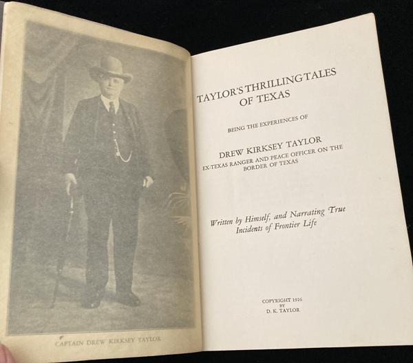 First edition. 8vo. Printed wrappers, 93 pp., frontispiece, [portrait], preface, illustrated. Includes tales of fighting with outlaws and Indians, hunting buffalo, massacres of settlers, trail drives, cowboying, etc. Six Guns 2183 says, "The author tells about some gunmen he knew, such as John Selman, John Larn, Clay Allison, and John Wesley Hardin. He also claims to have known Billy the Kid." Two inch closed tear to fore-edge of tissue protecting frontispiece portrait. Some modest general wear. Very good copy of a very scarce work. Signed presentation by Capt. D. K. Taylor on front free-endpaper. Housed in a cloth clamshell case with titles stamped in black on the front cover and spine.