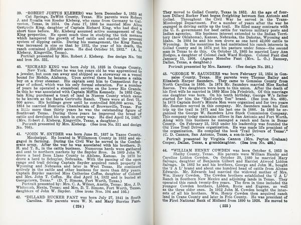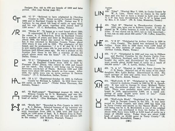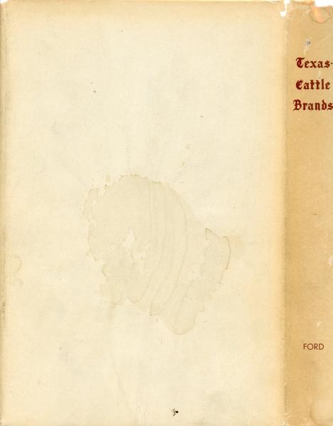 Second edition. 8vo. Red cloth, titles stamped in gilt on the front cover and spine, maps on endpapers, "in explanation," "in recognition," xx [2], 240 pp., illustrated with brands, maps, index to brand designs, index to branding irons. An exhibition of cattle brands and branding irons held in Dallas in 1936. An important range work that depicts 491 Texas cattle brands with illustration and history of each. Includes brief history of Texas Cattlemen’s Association by E. B. Spiller; “Brands as Evidence of Ownership in Prosecution for Theft” by Charles E. Coombes; “Texas Cattle” by W. L. Stangel; and biographical data on 53 noted ranchers of the 19th century. Non-authorial small gift inscription dated "1958" on the front fly leaf else a fine bright and tight copy in the elusive dust jacket that is a bit darkened on the spine, light wear to the spine ends, corners, and extremities. An important and elusive title and even more so in the dust jacket. This book was originally published in 1936 by Clyde C. Cockrell Company in Dallas, Texas. Both editions are difficult to locate today, especially in the elusive dust jacket.